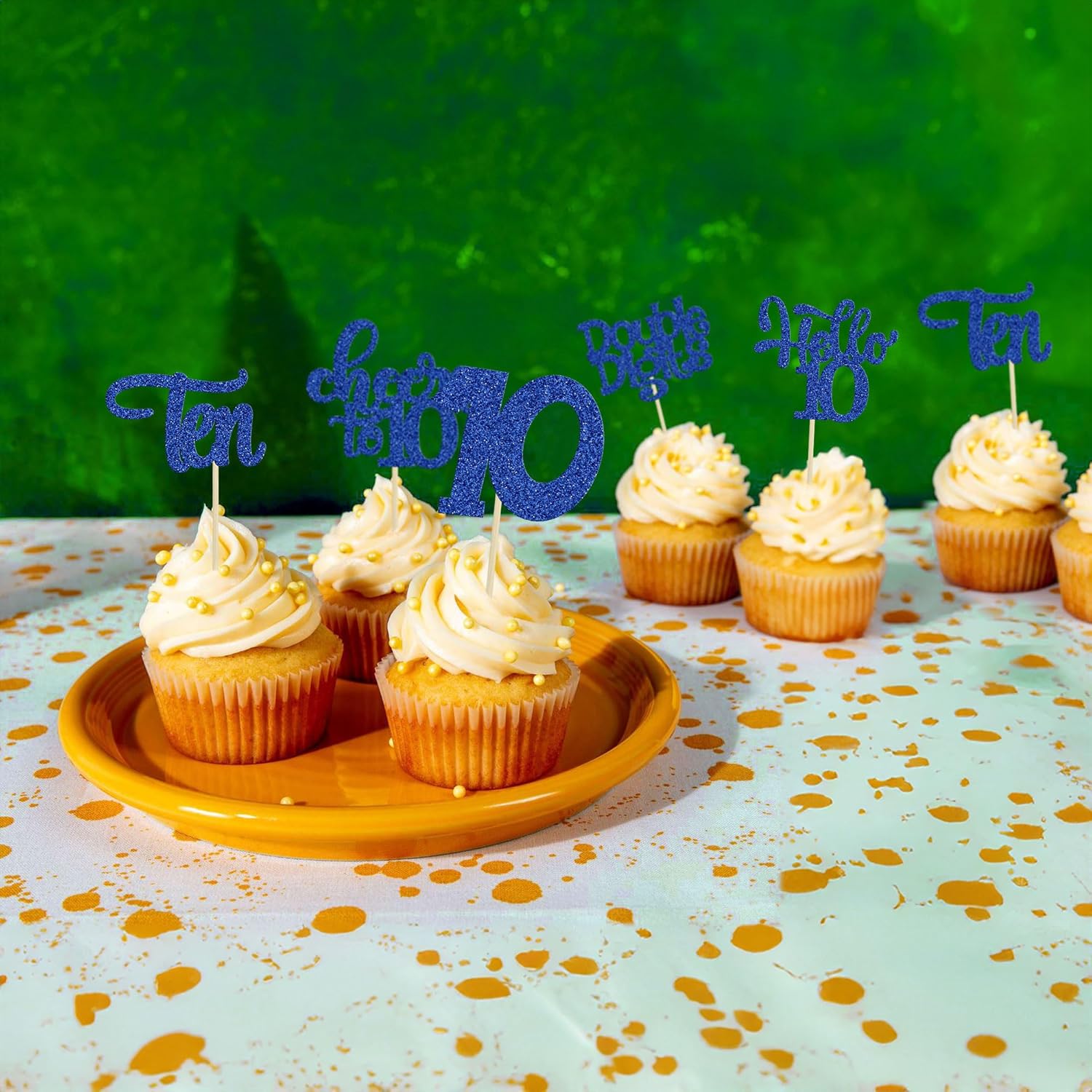 30Pcs 10th Birthday Cupcake Toppers Ten Double Hello 10 Cupcake Picks Cheers to 10 Years Old Cake Decorations for 10th Birthday Party Supplies Deep Blue Glitter
