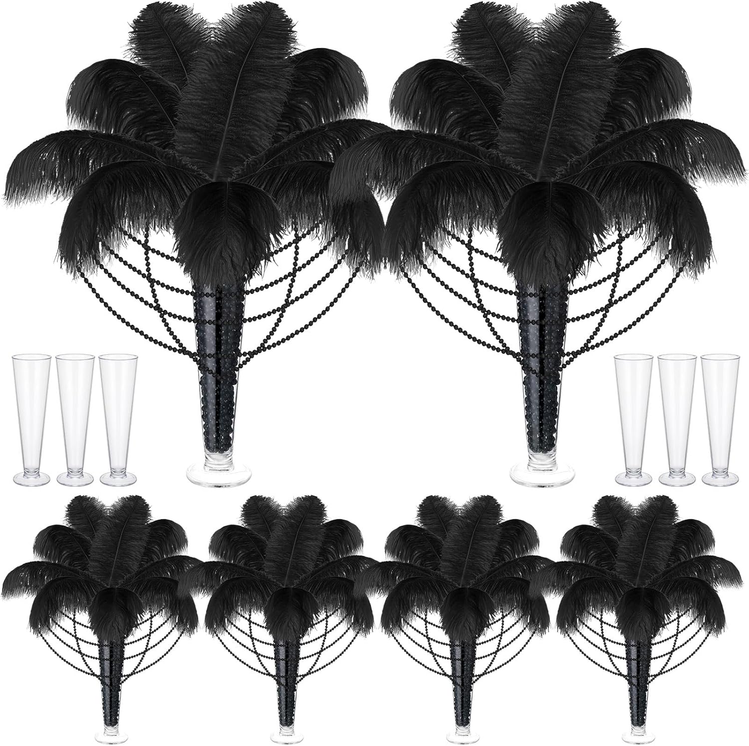 - Wedding Table Decoration Set: you will receive 54 black ostrich feathers for vases, 54 plastic hose sticks, 6 plastic vases, 9 rolls of black tape, 36 black beaded necklaces in bulk; Sufficient quantity for rich combinations, easily meet your wedding party, home decoration needs and DIY craft needs; You can also share it with your friends and family