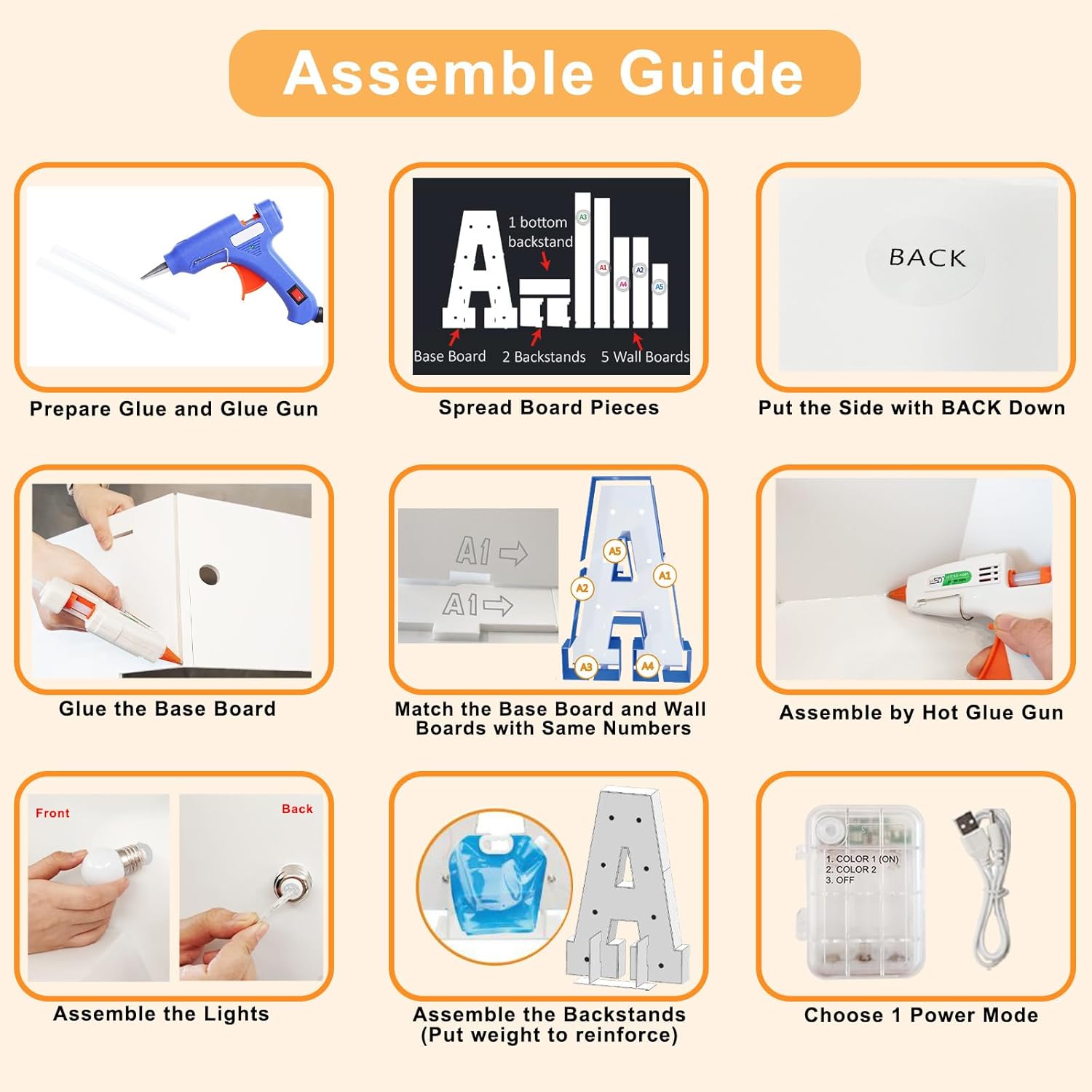 - Easy to Assemble: Pre-cut foam frame board letters are easy to set up: 1) Glue the base board and match the base board and wall boards according to same number. 2) Glue the base board and wall boards together. 3) Screw the bulbs into the board, connect LED lights and power on. (Noted: Glue gun, glue and batteries are not included)