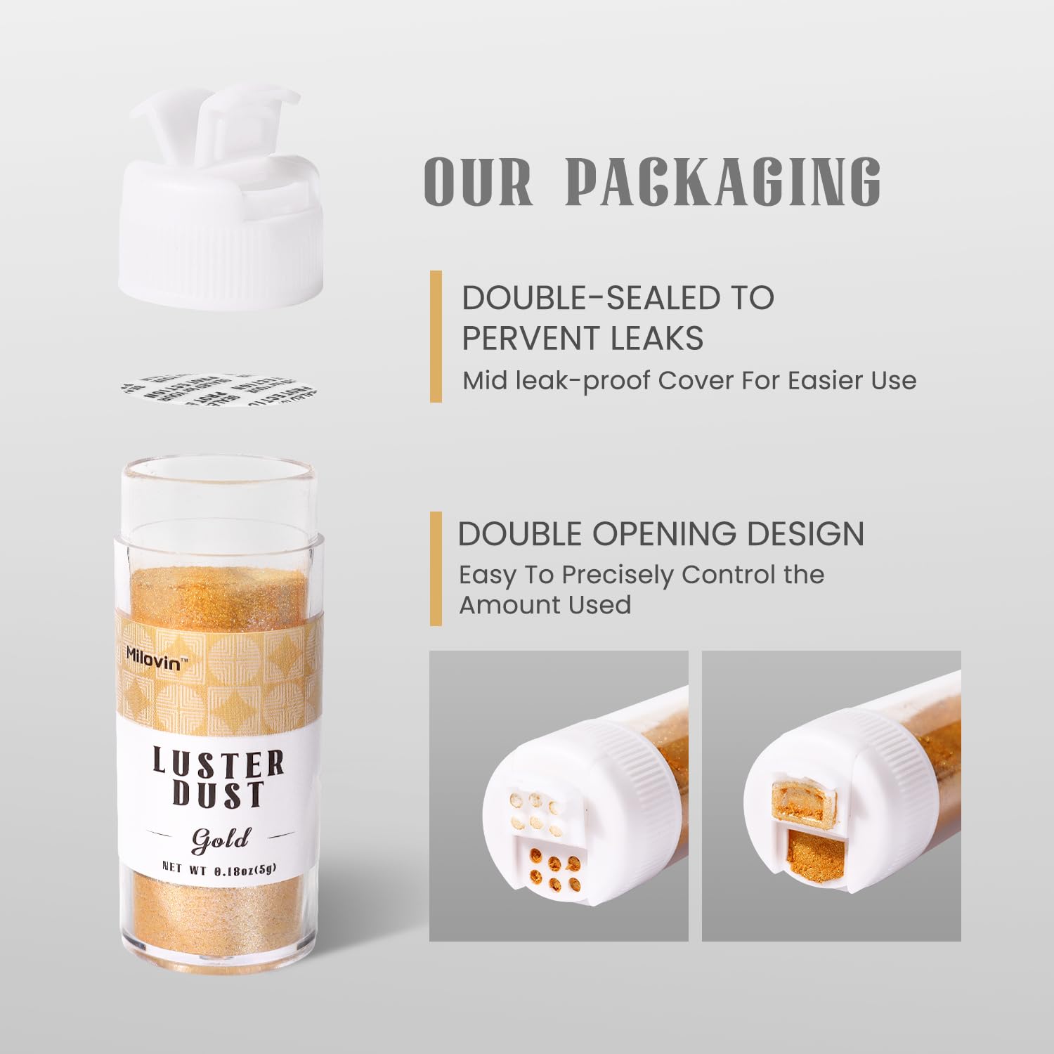- Easy to Use: You just need to tap the bottle lightly, then sprinkle the edible luster dust on top of your food or drink. (The powder will be affected during transportation, It may seem smaller, but the weight of the product is right)