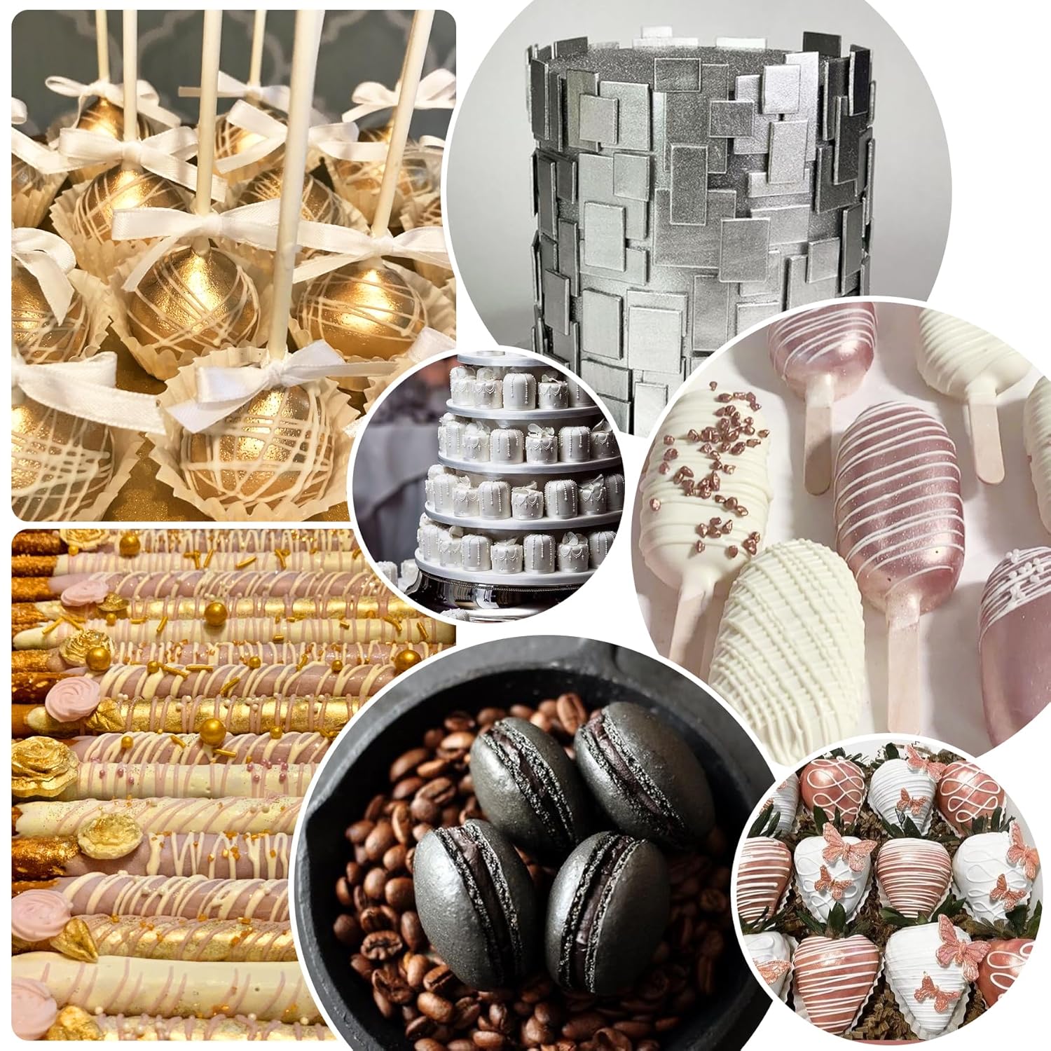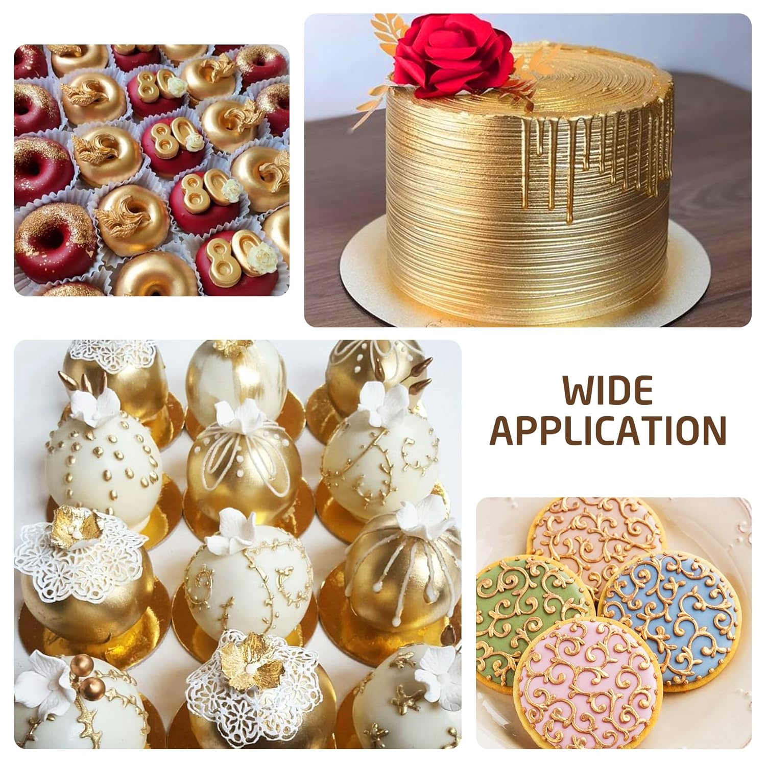 - METALLIC EDIBLE GLITTER PAINT - Specially crafted for food and baking decoration to get a metallic finish or add a gold-plated effect. All colors are brilliant and amazing. This fine texture edible cake paint can provide a high luster glitter effect to your cakes, chocolates, and candy!