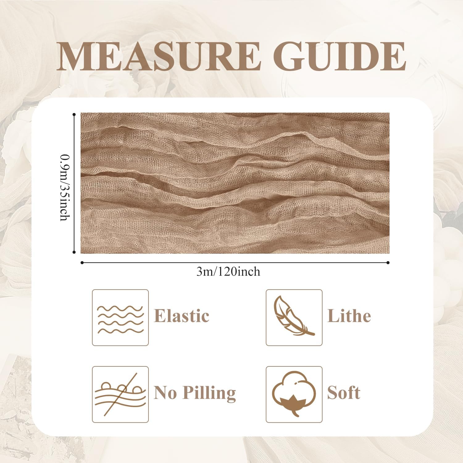 - 【Cheesecloth Table Runner】 Size: 35" W x 120" L. You will get 6 pieces 10FT length cheesecloth table runner. The sheer rustic table runner is long enough to span a large table and drape gracefully across the table. It will gently sway in the wind, adding a romantic atmosphere to your occasion. These eye-catching gauze table runners are ideal for arranging an elegant, stylish tablescape.
