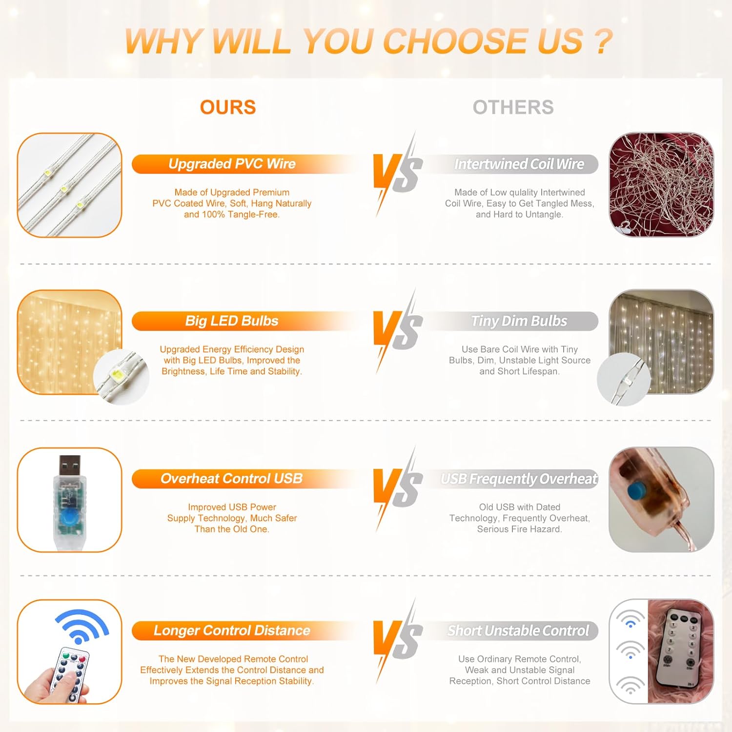 Fairy Curtain Lights Upgraded Tangle-Free Warm White USB Plug in 8 Modes String Hanging Lights with Remote for Christmas, Bedroom, Indoor, Outdoor, Weddings, Party (10FTx8.2FT)
