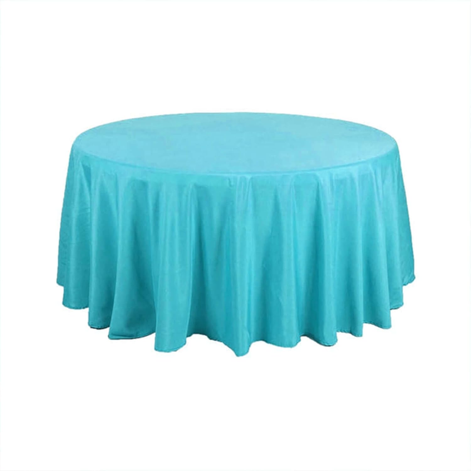 - Quantity: 1 Round Tablecloth Material: 100% Polyester Color: Turquoise Size: 120" Round Thickness: 130 GSM Stain & Wrinkle Resistant, Machine Washable Hemmed edges for an exquisite look. 1 piece, seamless design Gives floor length hang on standard 5ft (60") tables