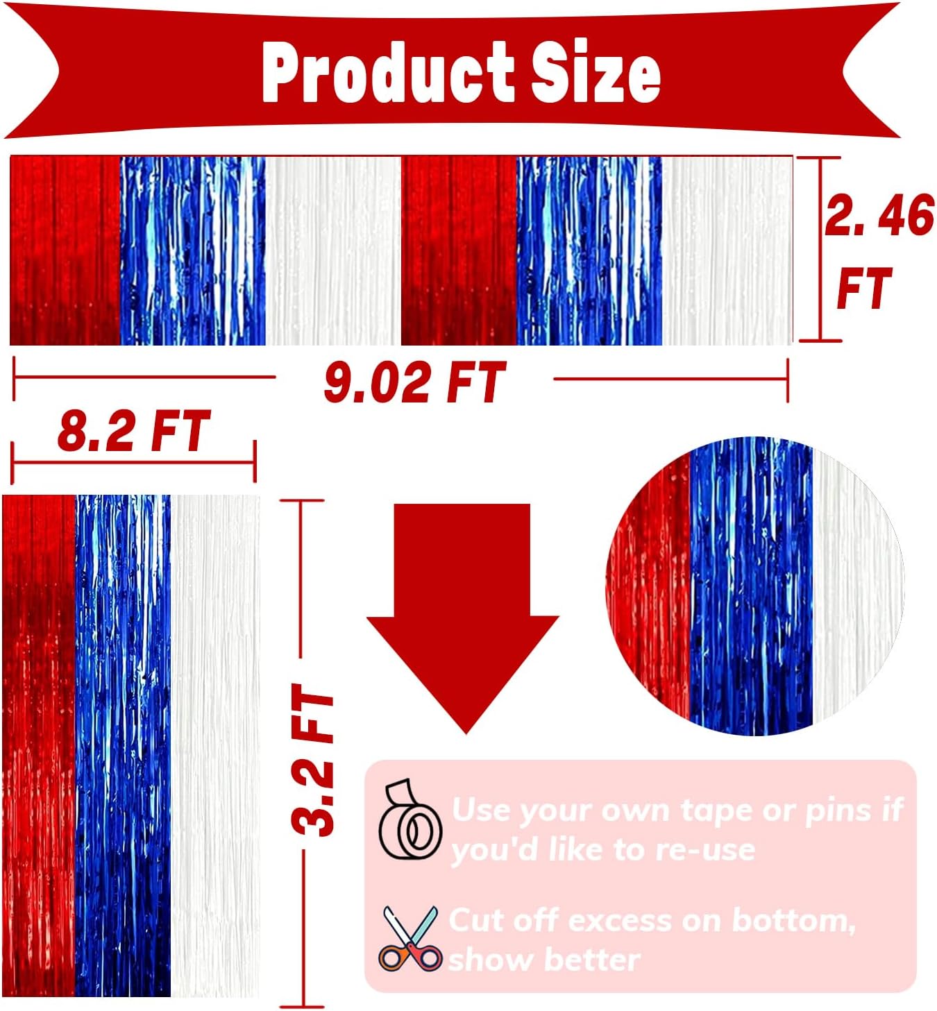 4P Metallic Foil Fringe Tinsel Table Skirts for Rectangle Tables Backdrop Banner Streamer Garland Curtains for Parade Floats Wedding Graduation Anniversary Birthday Parties Decoration(White Blue Red)