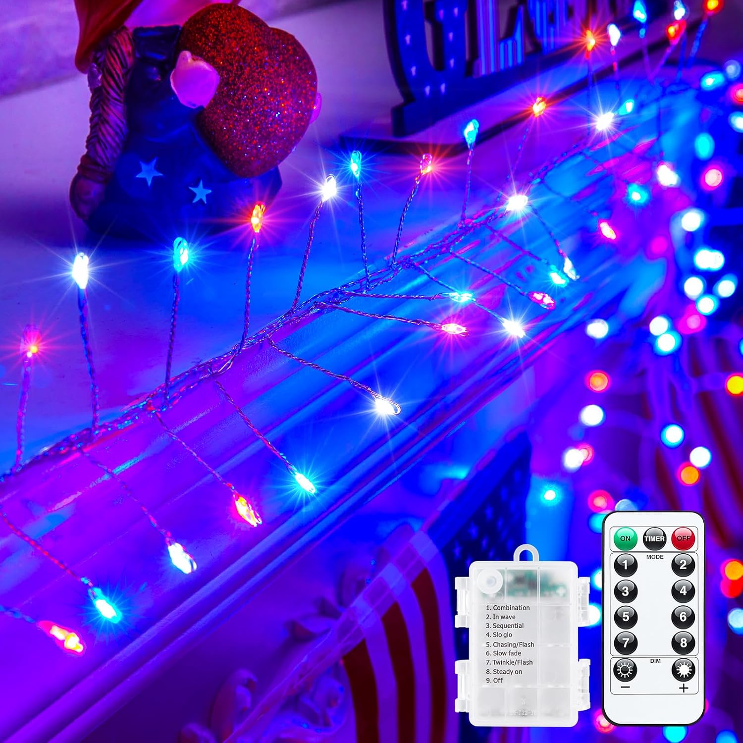 - Fairy Lights with Remote: These multifunctional patriotic string lights are super convenient, and enable us to switch eight flashing modes, and adjust the brightness quickly. Additionally, the timer function allows us to set up on/off time for 6hrs on/ 18hrs off. The twinkle lights will turn on automatically by settings, helping us to create a magic light show in the future.