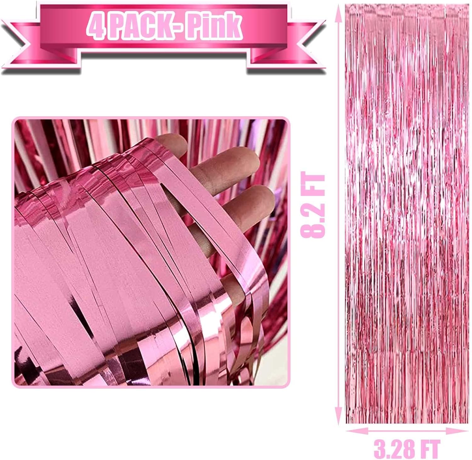 4 Pack Pink Foil Fringe Curtain Backdrop, 3.28Ft x 8.2Ft Metallic Tinsel Foil Fringe Streamer Curtains for Photo Booth Props, Birthday, Wedding, Valentine's Day Decoration Party Supplies New