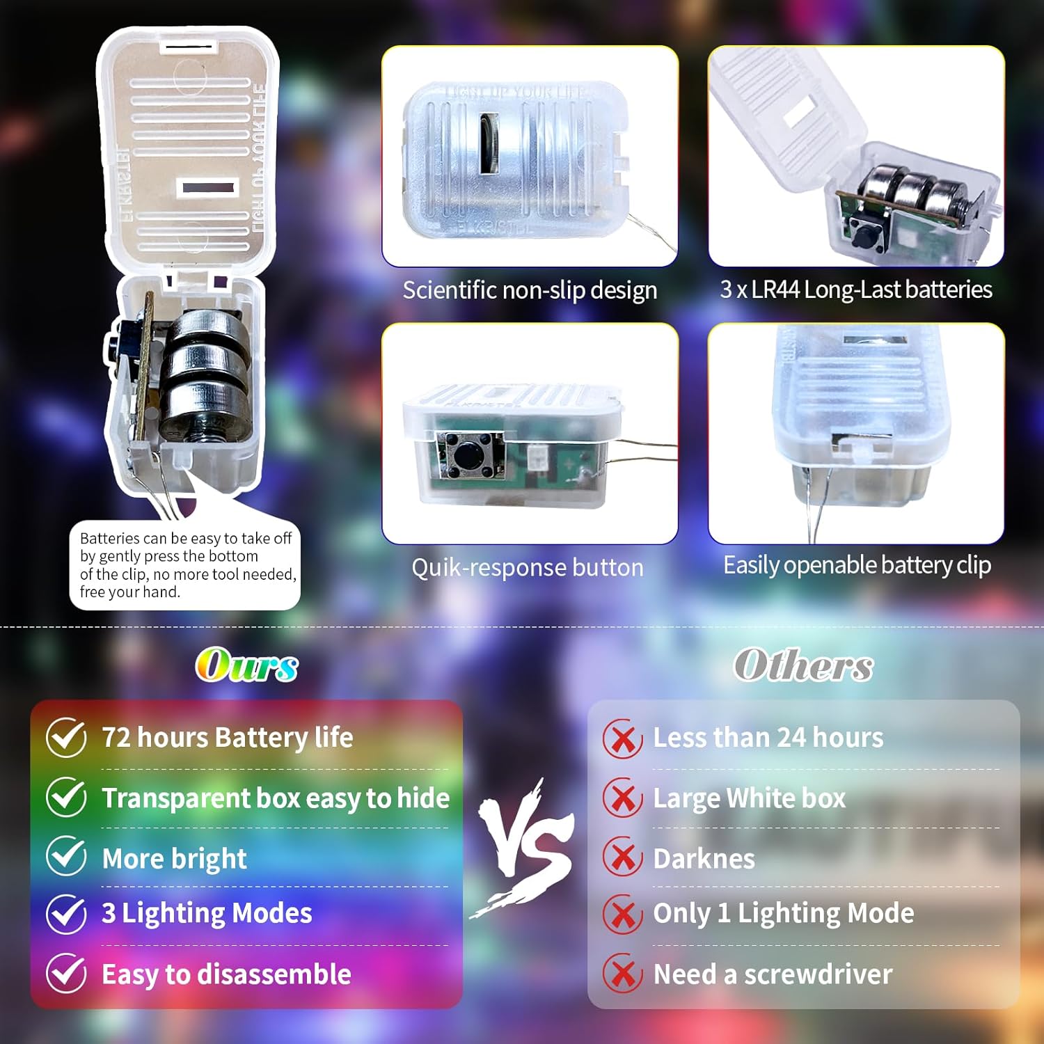 - PREMIUM QUALITY AND LONG LAST LIFE: 12 pack in a box, each twinkle lights made of high quality durable 7 feet long flexible silver wire, and 20 energy-efficient mini led fairy lights, 4 inch distance between each led moon lights. This fairy lights battery operated by 3 x LR44 batteries (included), which can provide 90 hours life. This Christmas lights is perfect for both everyday decorations as well as holiday decor (Batteries need to be replaced when the string get dims)