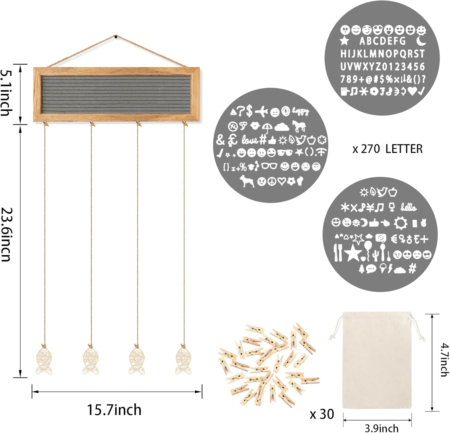 - DIY CREATIVE POLAROID PICTURE DISPLAY- This hanging photo display comes with a felt letter board, pre-cut 270 letters in a cloth bag, 30 clips, and 4 hemp ropes with fish-shaped rattan. Easily replace your favorite letters and symbols on the board, and adjust the length of the hemp rope, and the clips for changing the photo, a simple and creative way of DIY decoration.