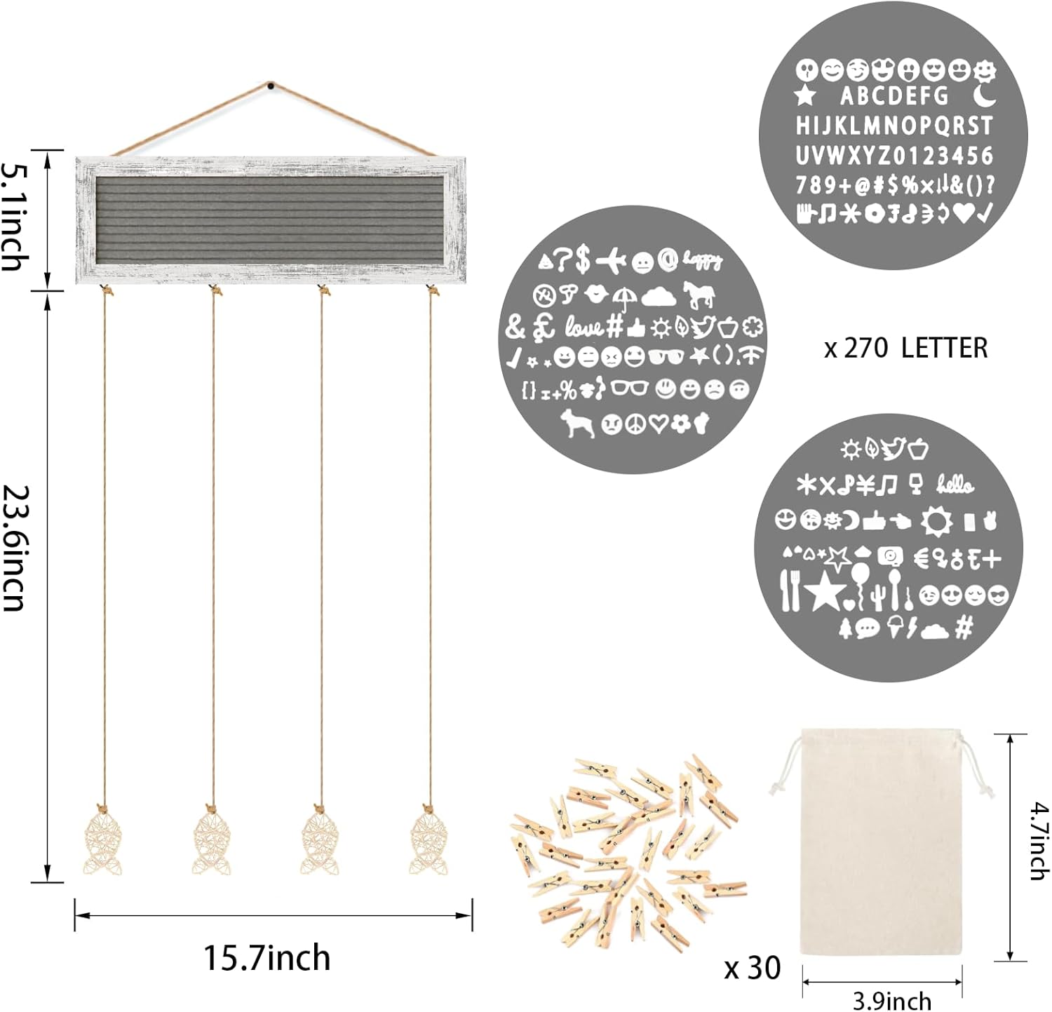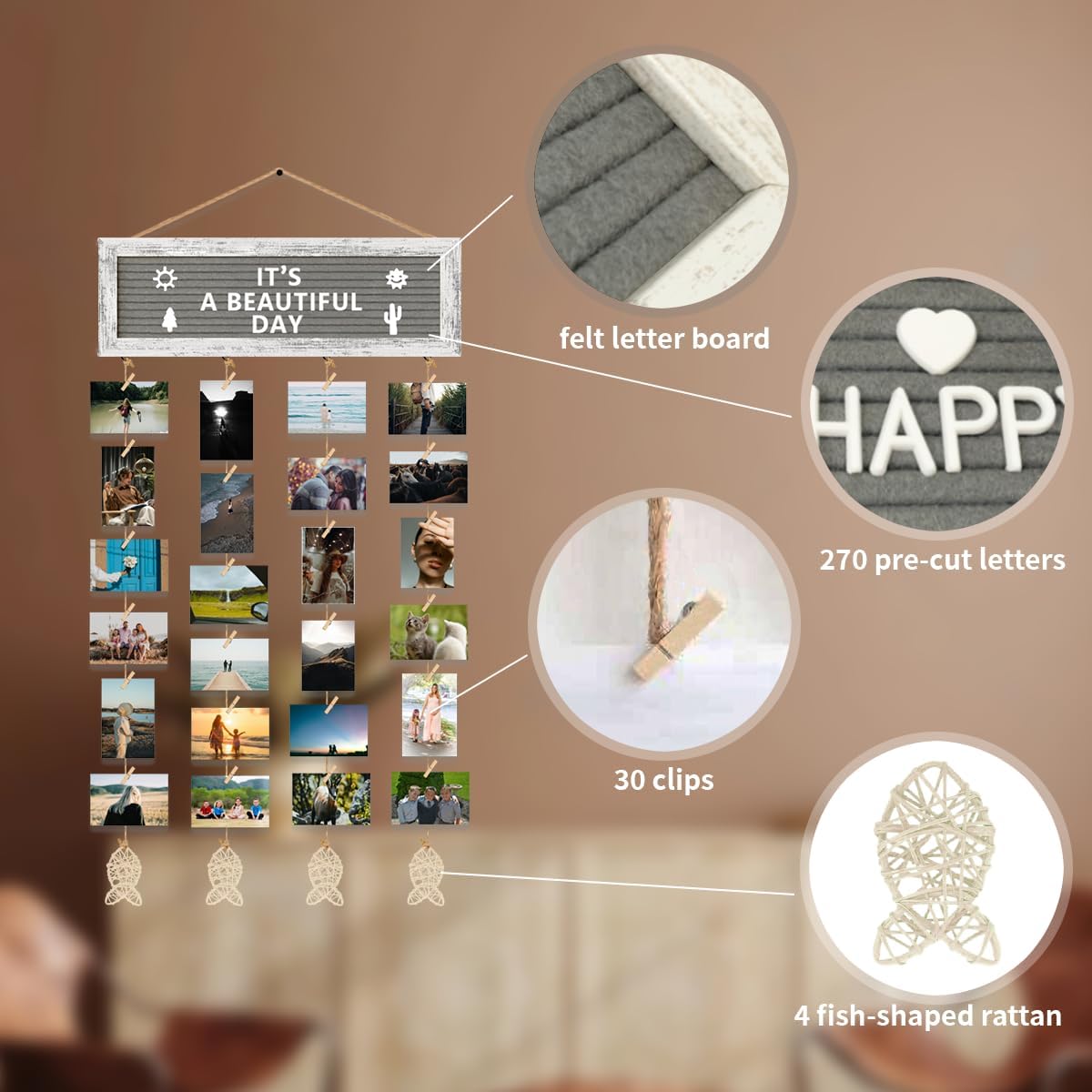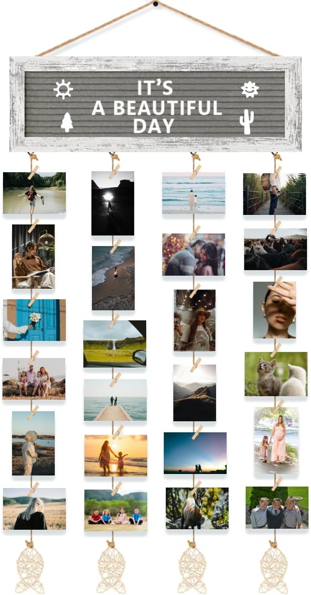- DIY CREATIVE POLAROID PICTURE DISPLAY- This hanging photo display comes with a felt letter board, pre-cut 270 letters in a cloth bag, 30 clips, and 4 hemp ropes with fish-shaped rattan. Easily replace your favorite letters and symbols on the board, and adjust the length of the hemp rope, and the clips for changing the photo, a simple and creative way of DIY decoration.