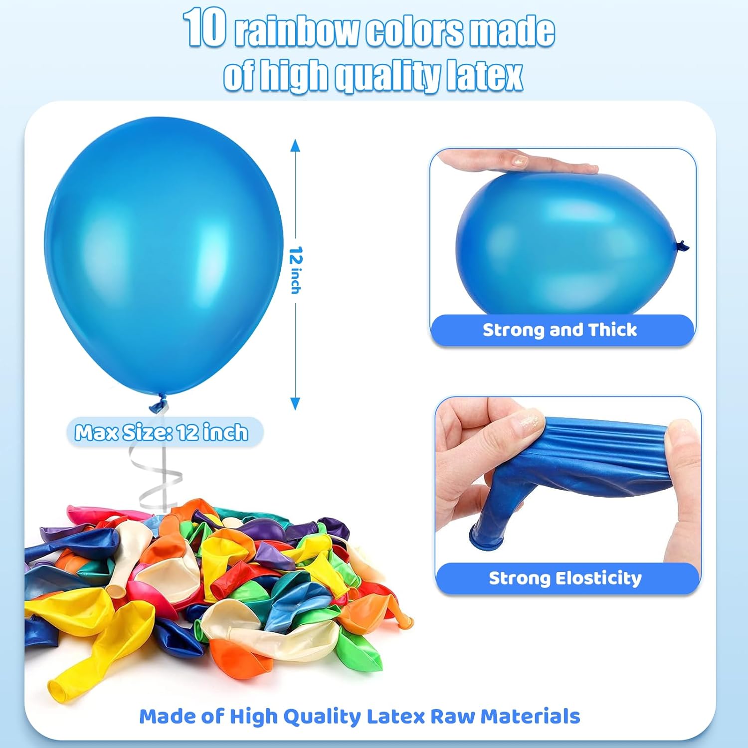 - 【Rainbow Party Balloons】 Each sets contains 60 pcs assorted party balloons of 12 inches 10 colors (red, orange, yellow, pink, dark green, light green, dark blue, light blue, dark purple, champagne gold) and 1pcs white ribbon (33 feet total). These multicolor balloons could make any dull space full of vitality and joy