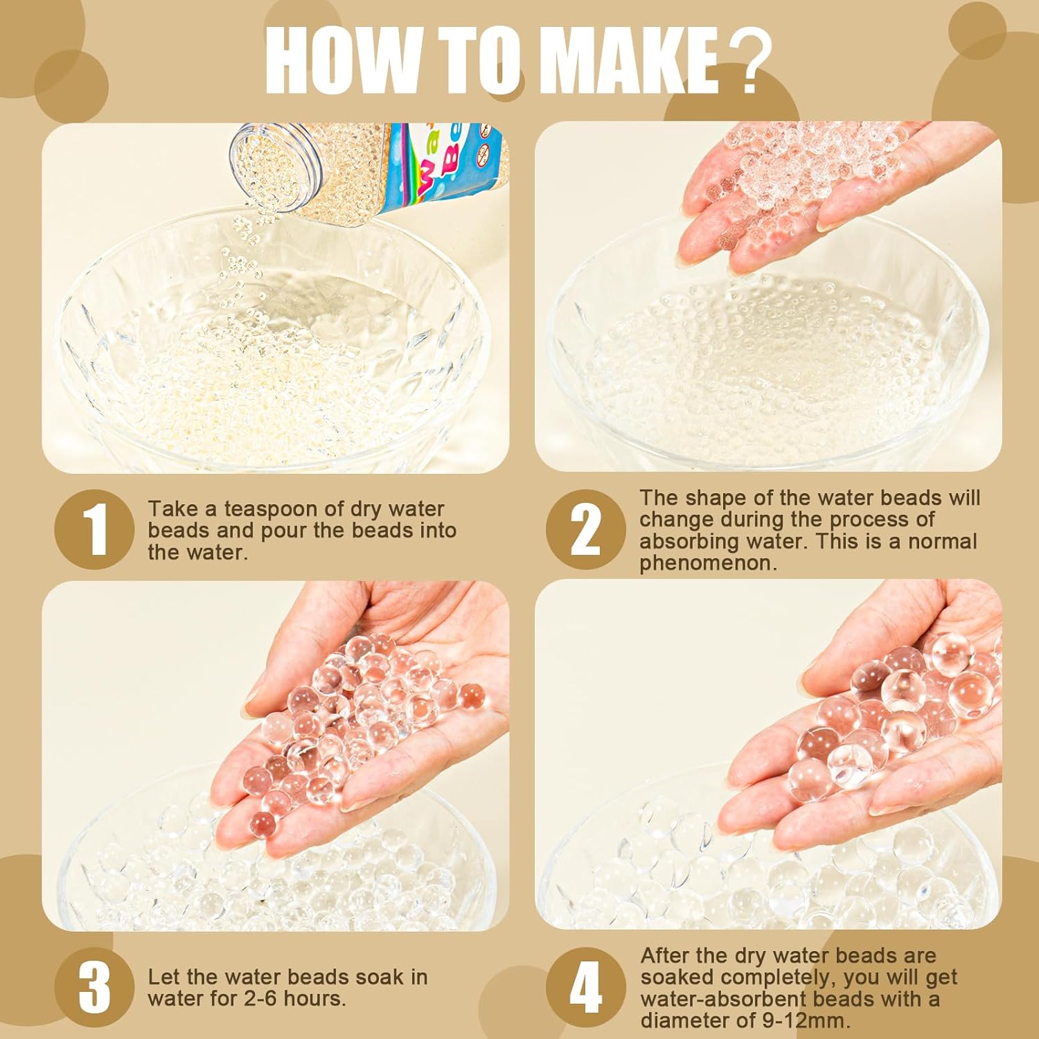 - Easy to Use: Take out the dry water gel beads from the packaging bag and soak them in water for 1-3 hours, and you will get the fully expanded water beads!