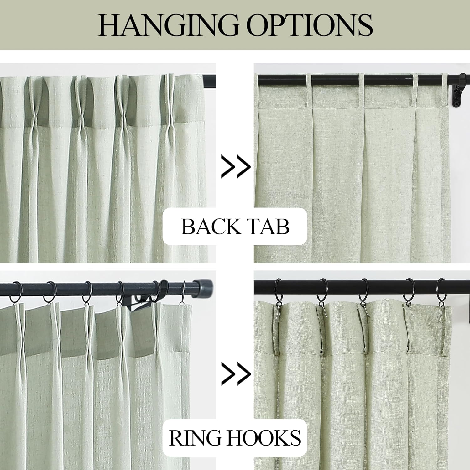- Pinch Pleats Design:Each page green curtain panel with 7 pinch pleats generates modern and luxury feel.Linen curtains provide a natural,organic,and textured look that complements a variety of interior styles.By offering linen curtains in various colors,patterns,and lengths,we can cater to customers looking for a casual yet sophisticated window treatment.Hanging these pleated curtains to elevate your windows and increase the aesthetic value to any spaces,bedroom,living room,nursery,office,etc.