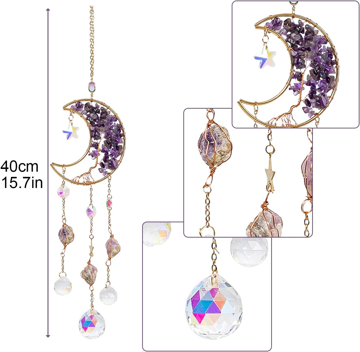 TUOKING Amethyst Crystal Moon Suncatchers for Window Hanging Tree of Life Natural Healing Stones Wind Chimes Sun Catcher Rainbow Maker Good Luck Gifts Decor for Home Garden