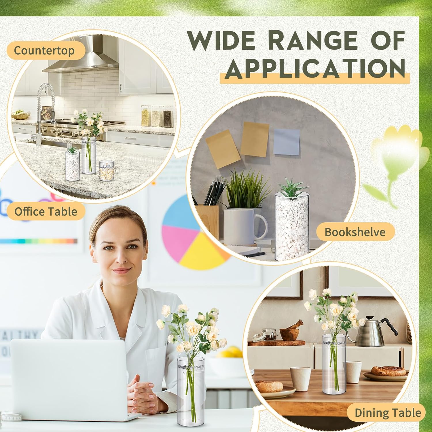 - Transparent Cylinder Design: the clear and transparent design of these wide vases allows for a beautiful and unobstructed view of the contents within, enhancing the visual appeal of your floral arrangements or candle displays; The sleek cylindrical shape adds a modern touch to any setting, making it an ideal choice for both casual and formal occasions