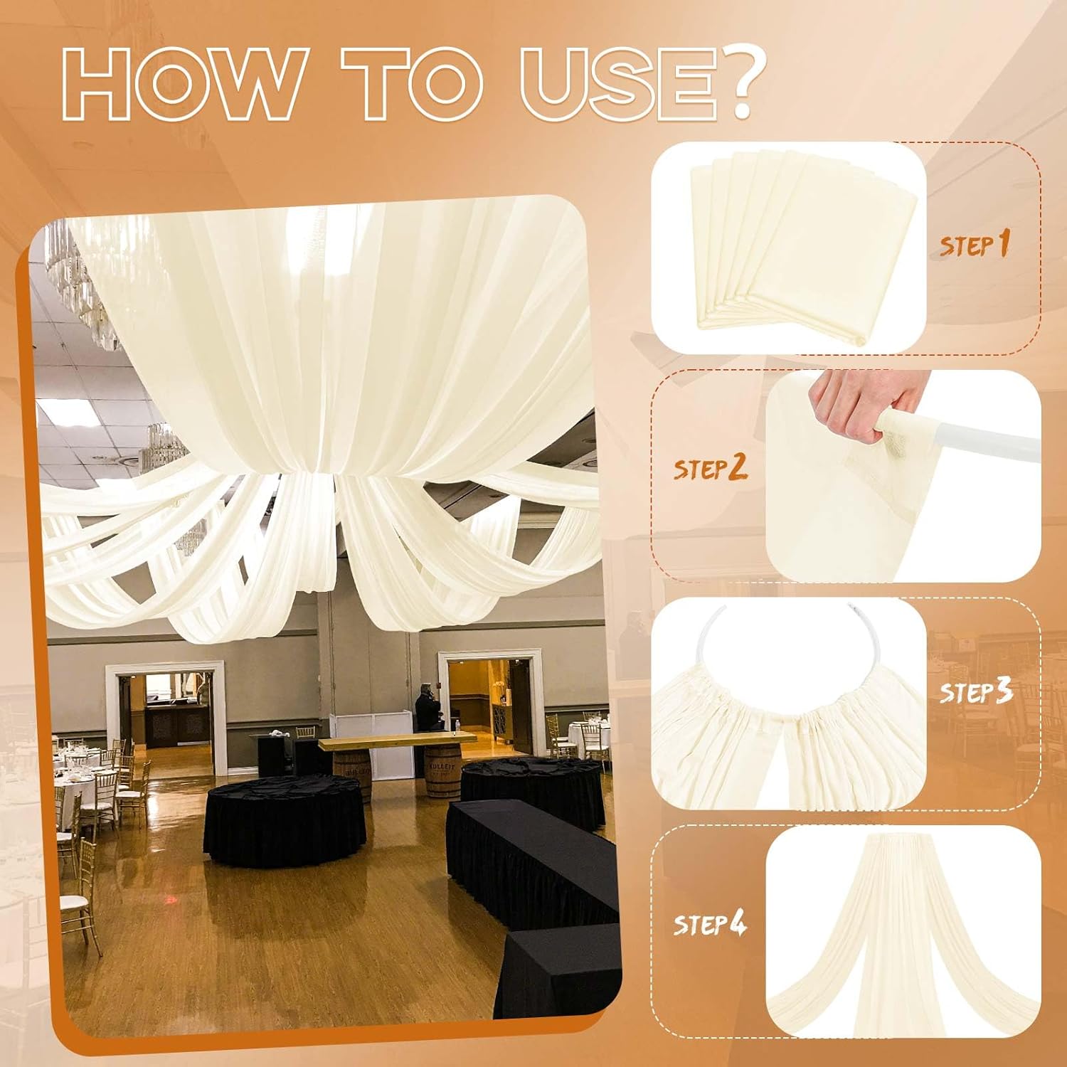 - 👑【Package Includes】You can get 6 panels Ivory wedding Ceiling Drapes (without hanging pieces). Each wedding extra long curtain measure for 5 feet width X 15 feet length. Enough quantity to meet your needs for decorating weddings, parties and decorating your wedding with romantic Ceiling Drapes will definitely bring you unexpected surprises.