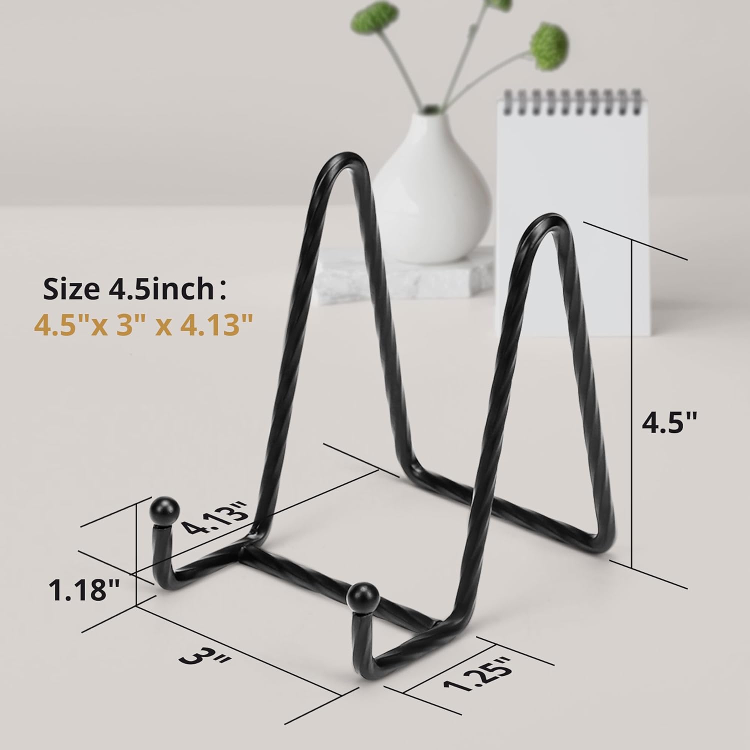 - Three 4.5-inch Display Stand: Exquisite flat-screen small plate stand. 6inch-12inch height/diameter display, deep lips: 1.18 inch. If the display items are heavier, limit the size to 2-3 times the height of the bracket, otherwise the picture stand will be unstable.