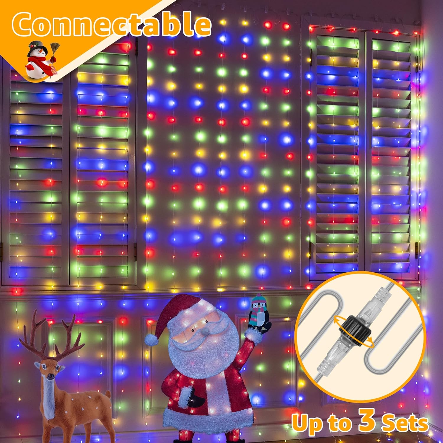 Ollny Curtain Lights 300 LED 9.8FT x 9.8FT, Connectable IP67 Waterproof Outdoor Christmas Curtain Lights with Remote, Plug-in Untangle Fairy Lights with 8 Modes&Timers for House Decor(Multicolored)