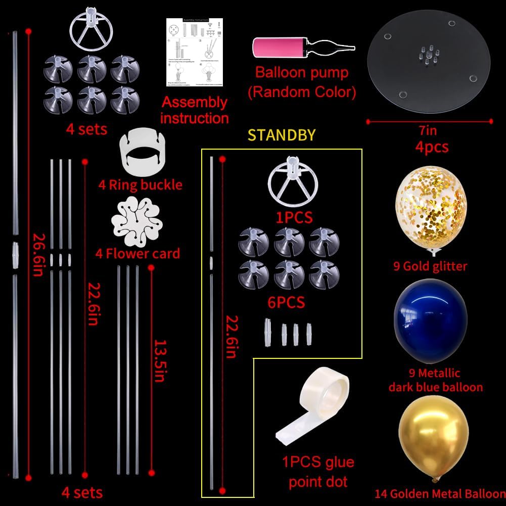 - Package Includes: The balloon arch kit includes 4 reusable balloon centerpiece table decorations and 12inch 32 pcs Latex Balloons (14 gold balloons,9 navy blue balloons,9 gold confetti balloons),glue point dots,balloon pump,balloon clips,and tie tool.You don’t need to waste money to buy balloons