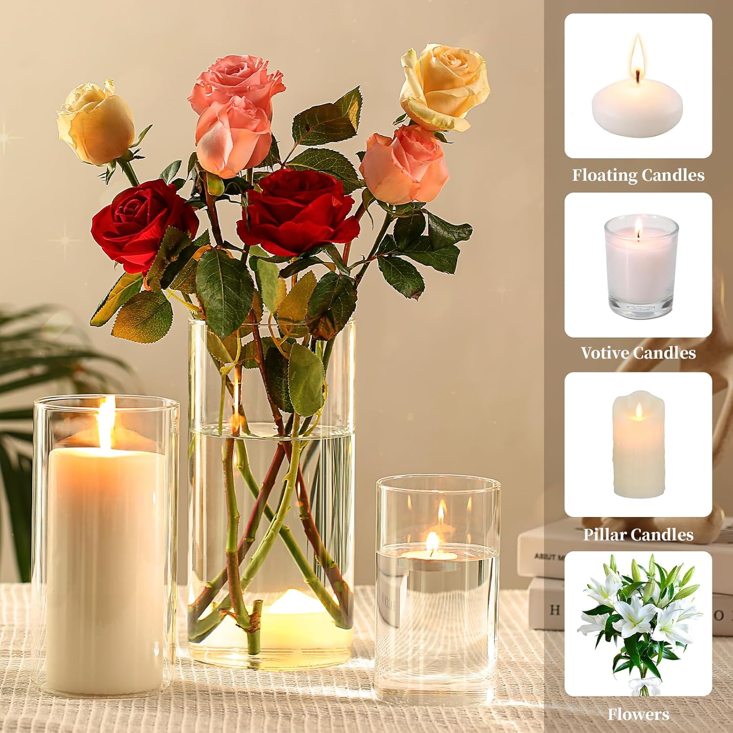 - 3 Different Sizes Candle Holder: The set glass candle holder includes 3 different size¡ªLarge Size: width 4.7'' x height 10'', Medium Size: width 3.9'' x height 7.8'', Small Size: width 3.3'' x height 5.9'', each size 6 pcs, It can be used as a pillar candle holder, floating candle holder, and vase for flowers, which is the ideal choice for modern home decoration