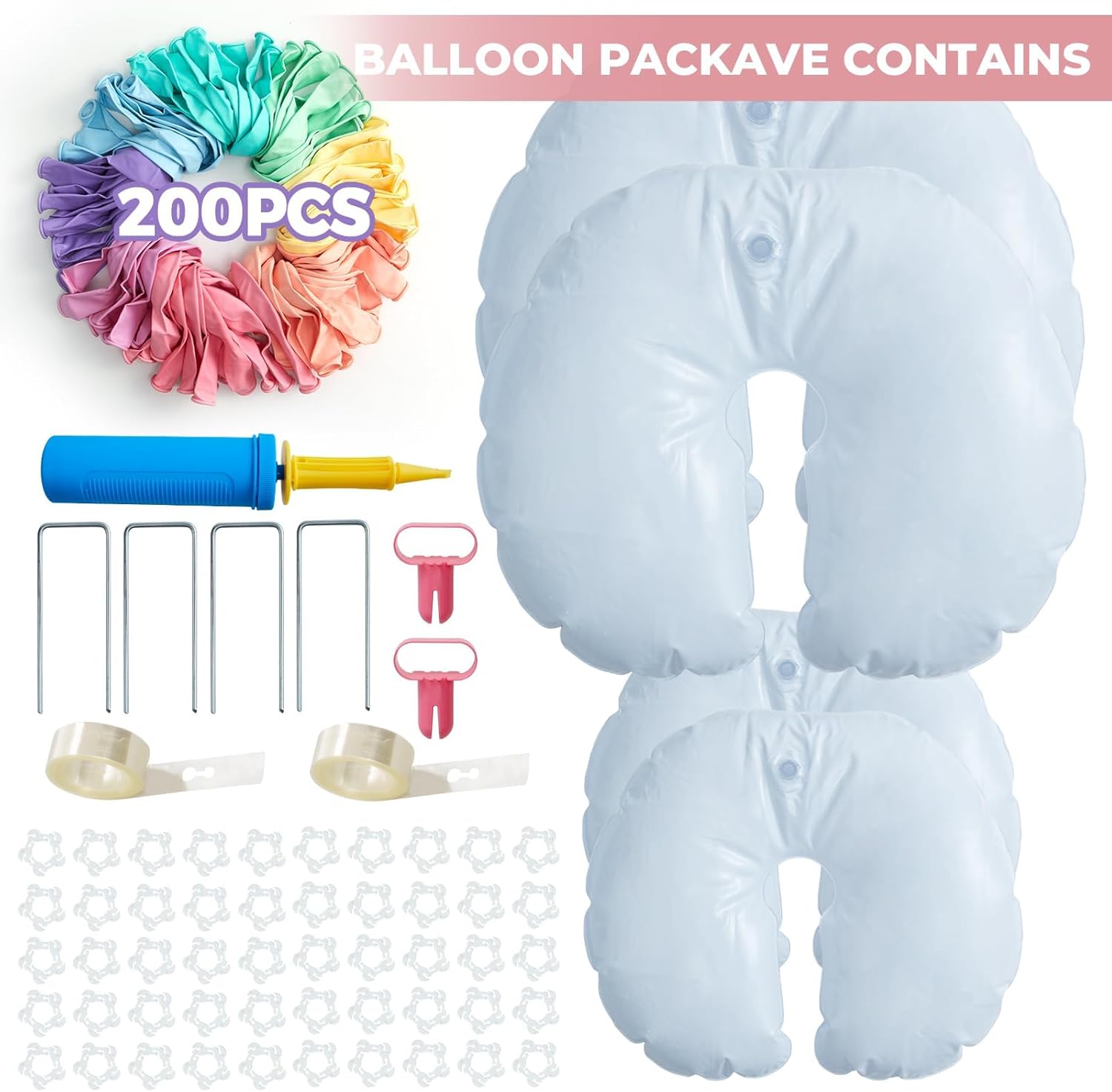 - PACKAGE--This balloon arch backdrop stand kit includes 2 PCS backdrop stands and 200 PCS balloons. οΌ2 big water bags, 2 small water bags, 4 ground stakes, 2 rolls of hole tape, 50 flower-shaped clips, 1 hand-held pump, and 2 knotters).A sufficient number of balloons can create a perfect balloon party decoration background, arch stand size: 7.2FT x 4FT(H x W) and 6FT x 2.6FT(H x W).