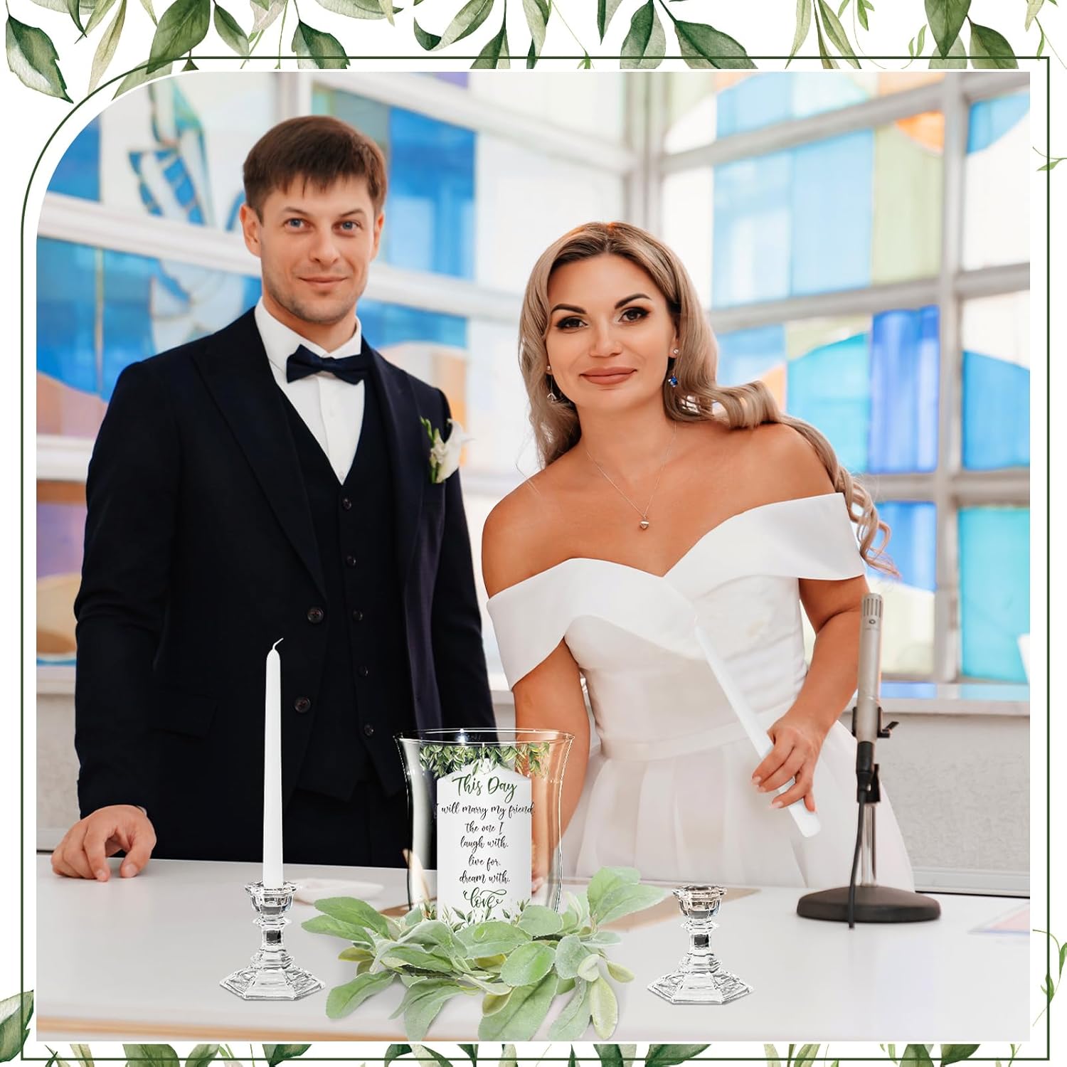 Irenare Unity Candles with Holder for Wedding Ceremony Wedding Decortions Accessories Glass Candle Holder Pillar Candle for Formal Events Church(Green Leaf)