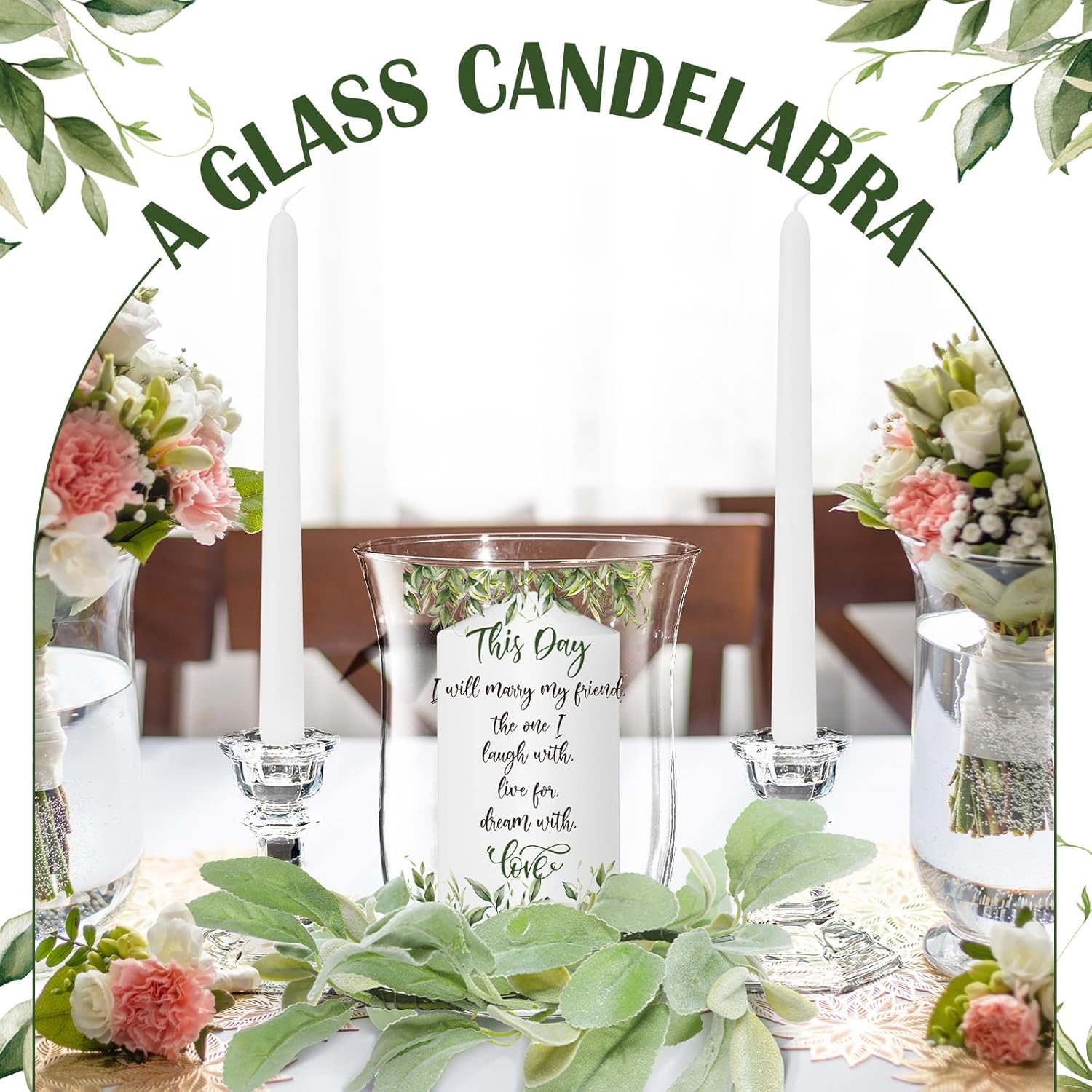 - What You Will Receive: the package includes 3 wedding candles, 3 glass candle holders for pillar candles, and a eucalyptus leaf candle holder garland; They are very coordinated together and can decorate tables and parties to create a romantic atmosphere; Well packaged to ensure safe arrival
