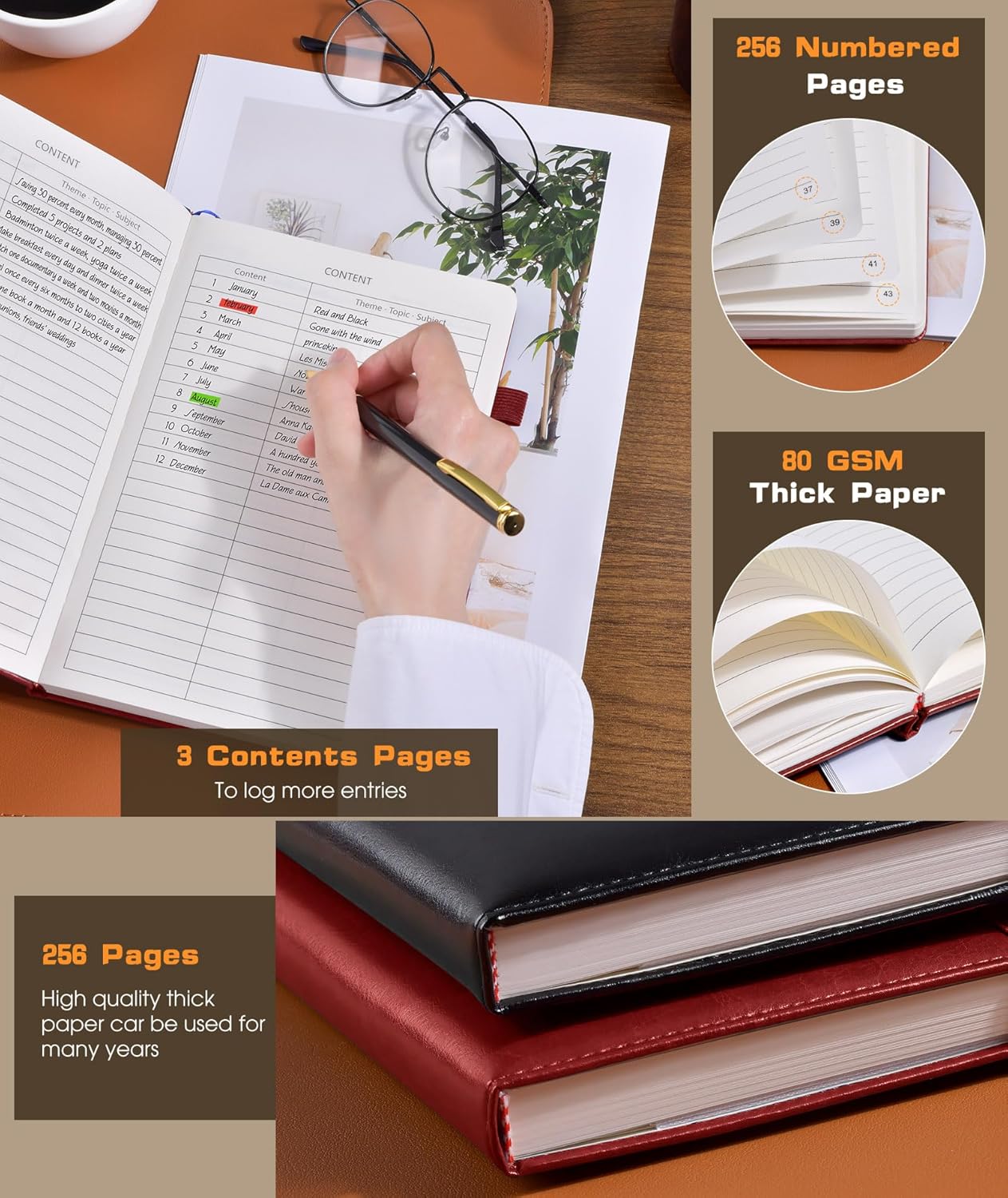 - 【256 Numbered Pages with Contents】 This journal notebook is specifically designed to provide you with all the writing space you need. It includes 256 pages numbers and a 3-page blank table of contents, you can jot down important notes from various pages and note them in the front of the book for easy and fast reference. 80Gsm acid-free ivory paper that's smooth to the touch and thicker than your average notebook. Which ensures that there will no ghosting or bleed-through on your pages.