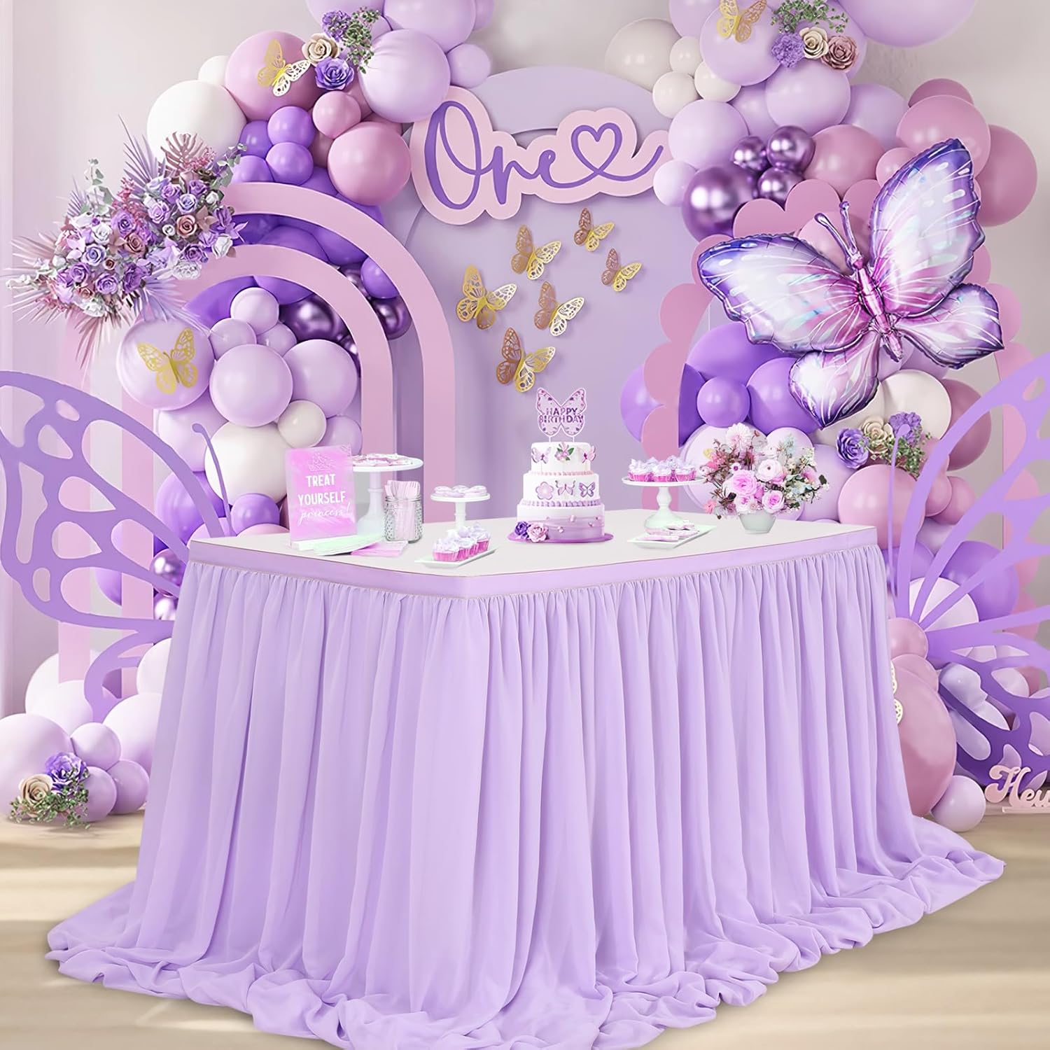- π‘ Lavender Table Skirt Material: The extra long chiffon table skirt is made of Sheer Chiffon which is wrinkle-free, soft, and with a nice drapery. Table skirt both robust for kids birthday party supplies and elegant if used for wedding decoration.