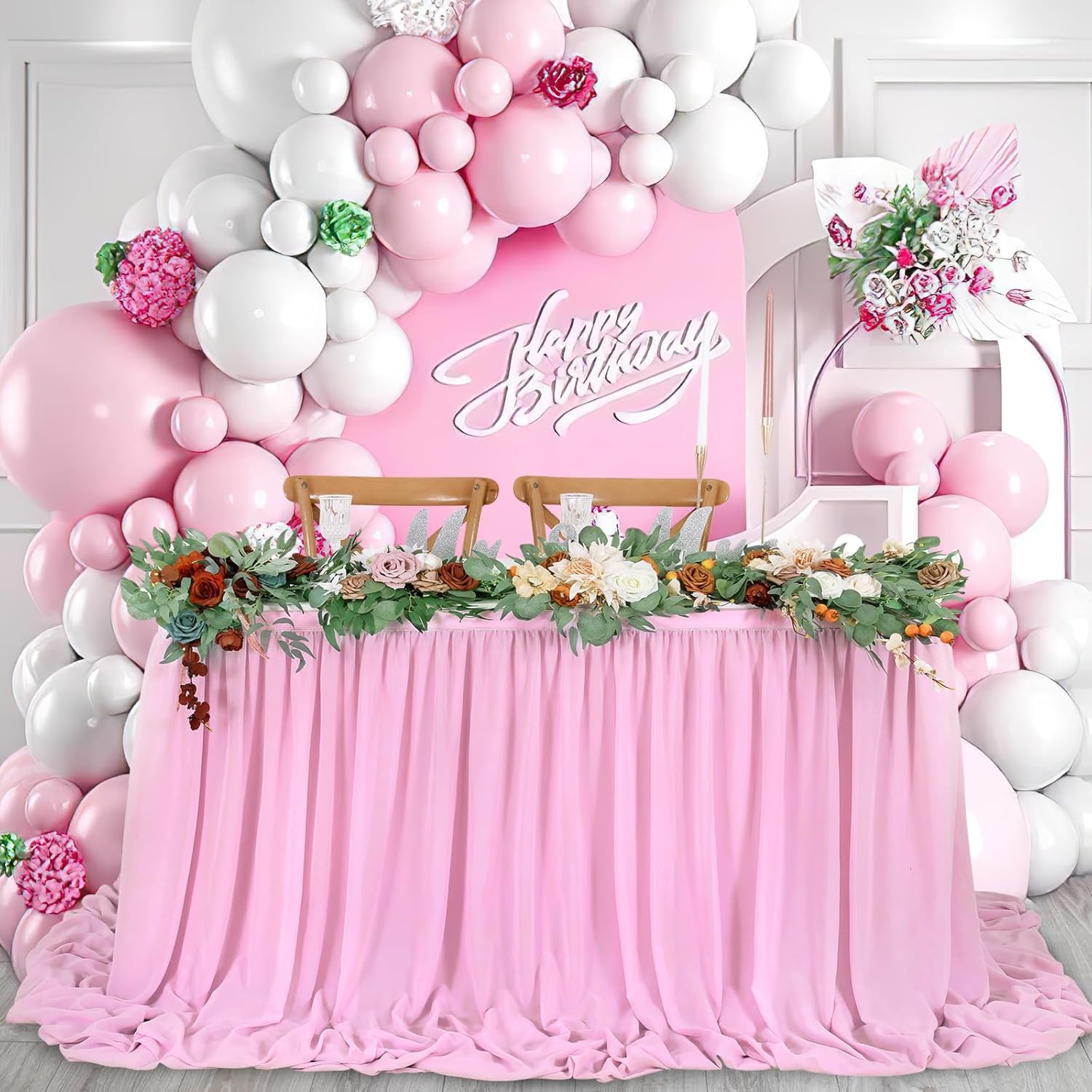 - π‘ Pink Table Skirt Material: The extra long chiffon table skirt is made of Sheer Chiffon which is wrinkle-free, soft, and with a nice drapery. Table skirt both robust for kids birthday party supplies and elegant if used for wedding decoration.