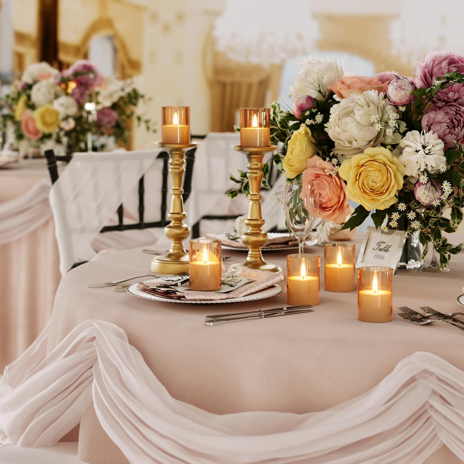 12Pack Flickering Flameless LED Candles with Timer, Battery Powered - Small Pillar & Votive, Acrylic Made, Gold (2"X3")