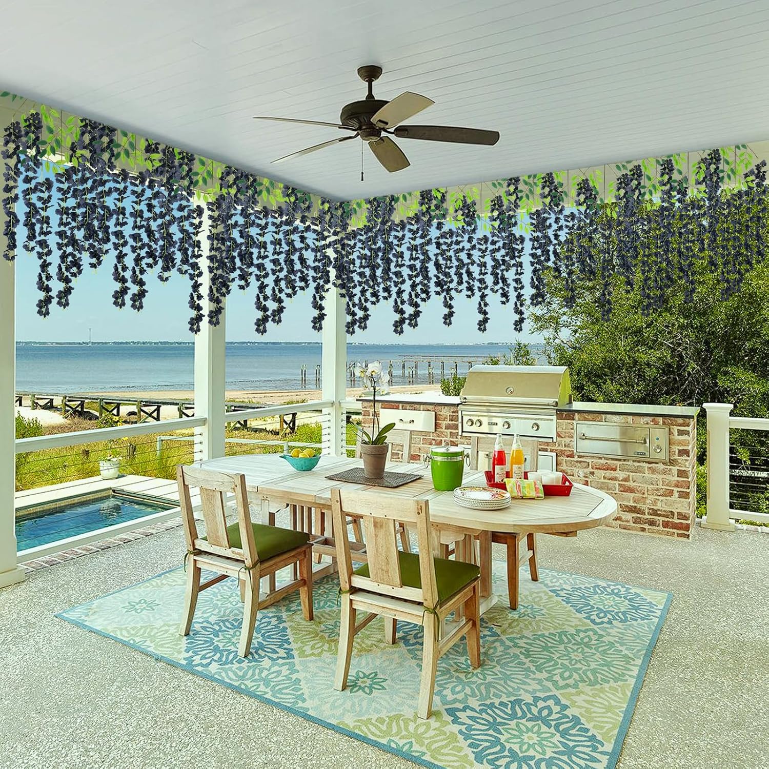 - 🌼Material - Silk and Plastic. The artificial wisteria hanging flowers are vibrantly colored, the veins of the leaves are distinct, look like real flowers, vivid wisteria petals has real natural-looking. These realistic and beautiful wisteria flower vines are perfect for home table arrangement, wedding decoration and living room party decoration. These wisteria garlands are also suitable for outdoor decoration.The petals and leaves are also very firm, can stand the test of time.
