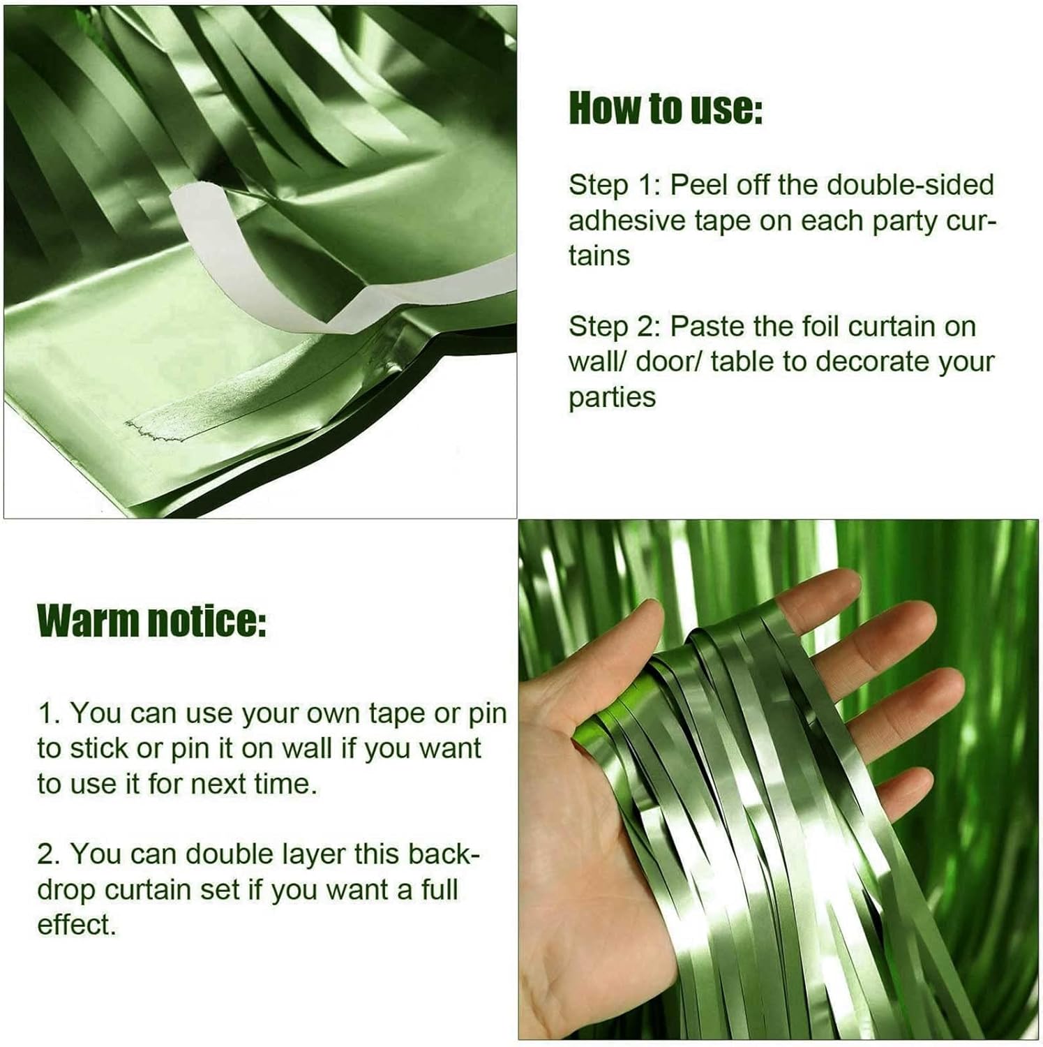 - The foil curtains good for party backdrop curtain, place on a wall and serves as a background for photos of any celebrations like: birthday party, theme party, Halloween, Christmas, New Year Eve, bachelorette party, wedding, bridal shower, baby showers, graduations and more.