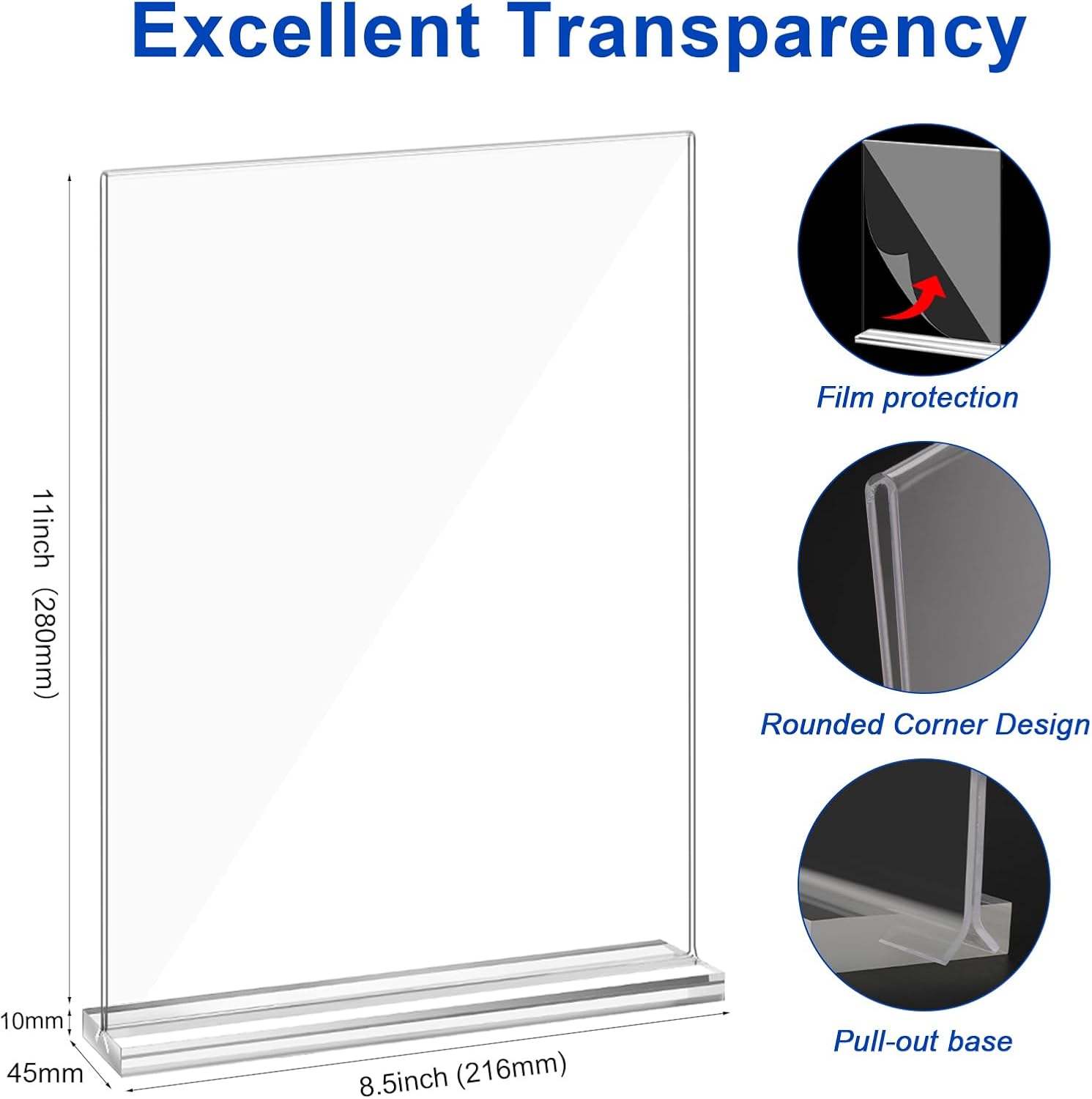 - 【High-Quality Acrylic Material】: Our desktop display stand is made of high-quality acrylic material, which is lightweight, durable, transparent, smooth, anti-falling, not easy to yellow and darken, and it can be used for a long time. Acrylic sign holder size: 8.5x11 inches.