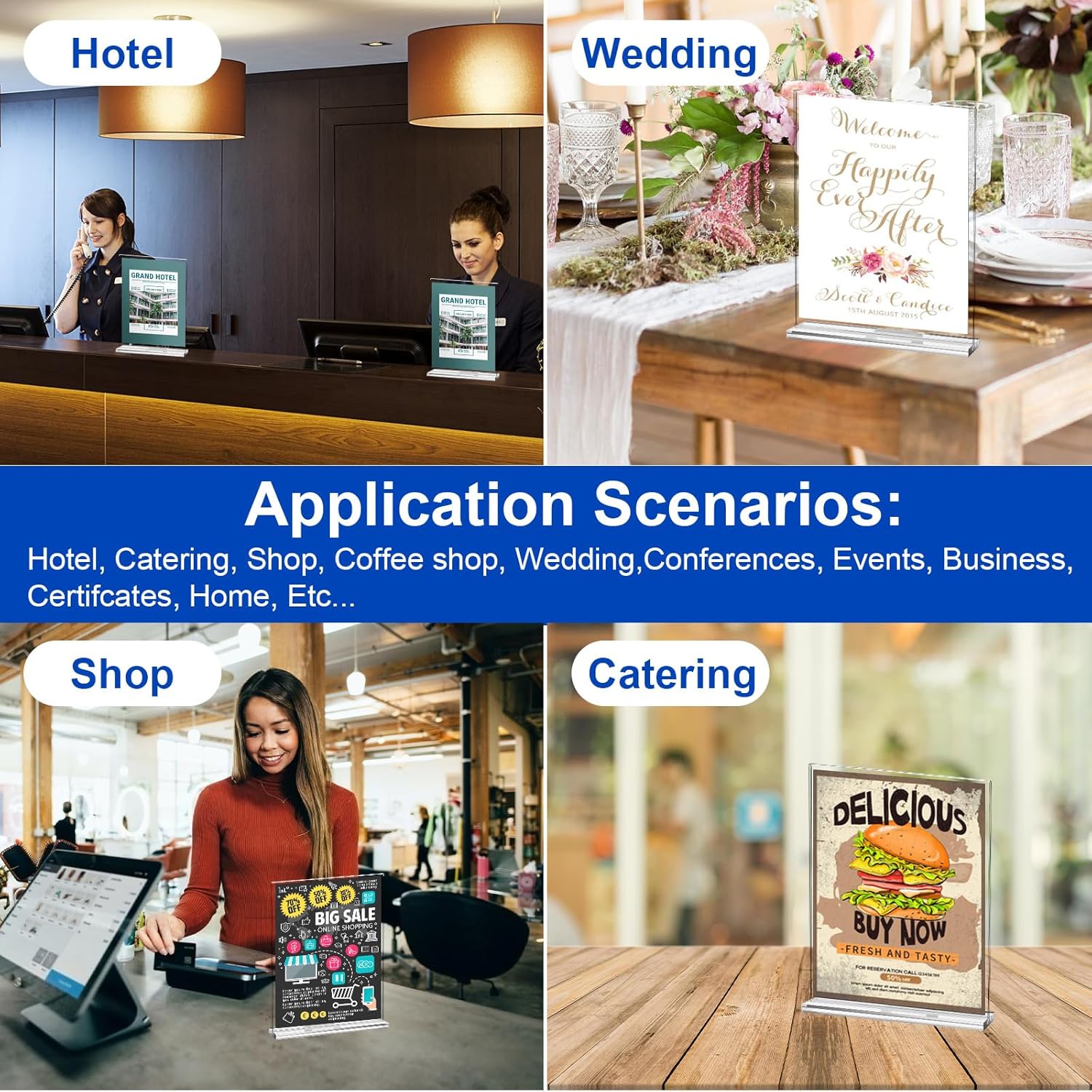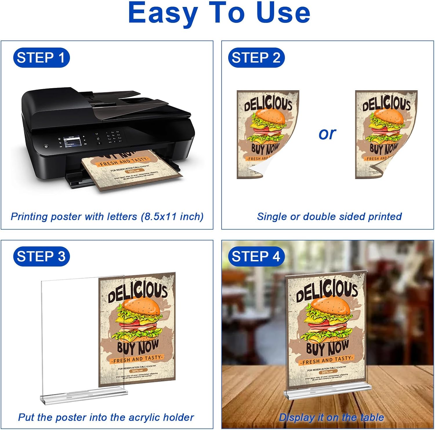 - 【Double-Sided Display Stand】: Double sided display frame allows you to display your content from both sides, ensuring maximum visibility and exposure, it is suitable for menus, flyers and table signs. Note: Please tear off the protective film before use for clearer display.
