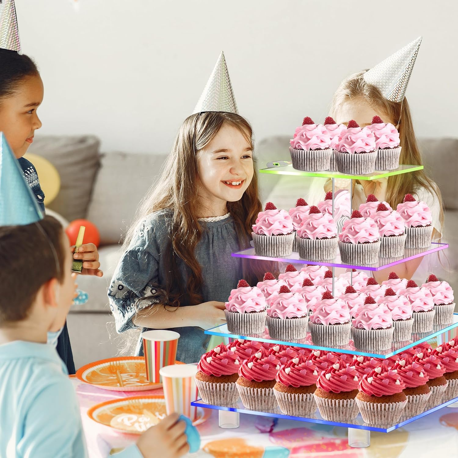 Rechargeable LED Cupcake Stand for 50 Cupcakes, 7 Colors Light Clear Cupcake Holder, 4 Tier Cupcake Tower, Acrylic Dessert Table Display Set for Weddings, Christmas, Birthday, Parties