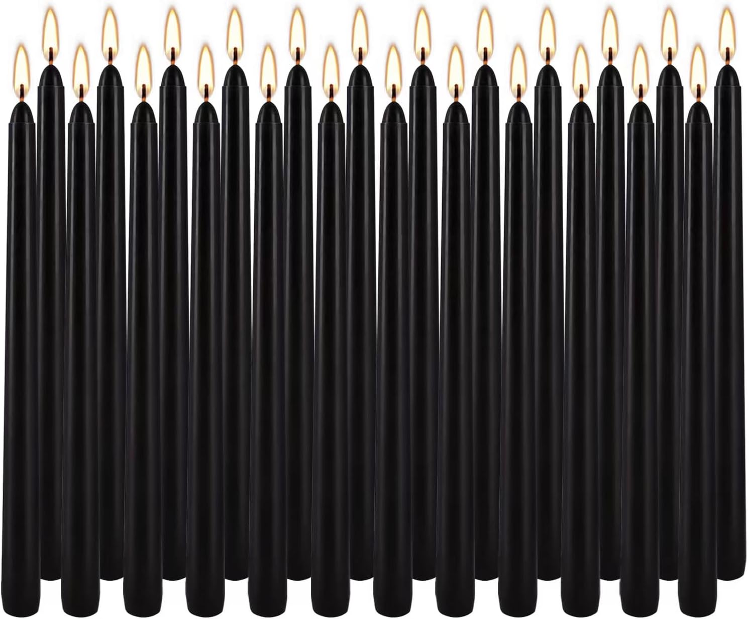 24 Pack Black Taper Candles, 7-8 Hours Burn Time, Unscented, Smokeless and Dripless, 0.75 x 10 Inch Dinner Candle Set for Halloween, Household, Wedding, Party and Home Décor Candlesticks