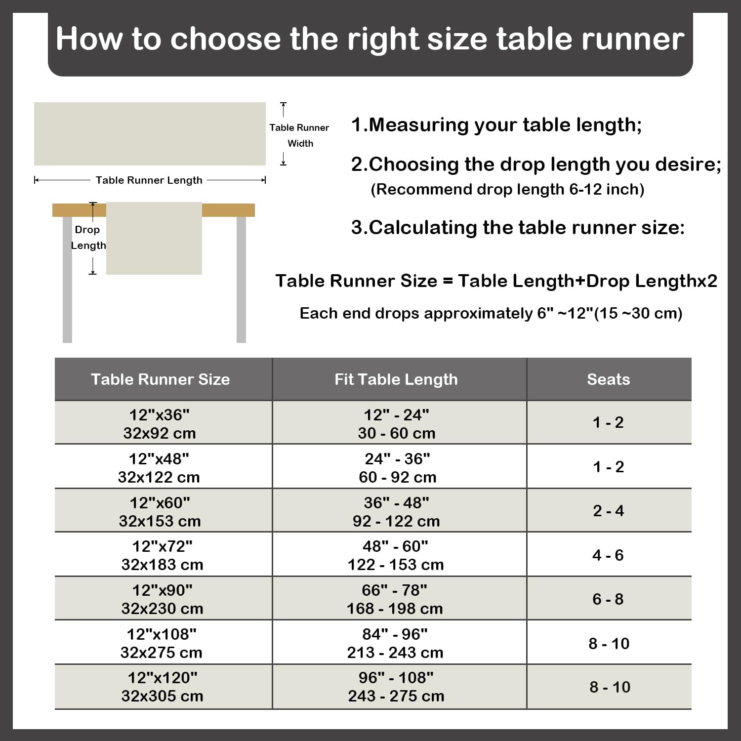 - Size Guide: This farmhouse table runner is 12X90 inch, suitable for dining tables and other furniture that fits the size of the table runners like dressing tables. The length may have a slight deviation due to manual tailoring and there may also be a slight color difference due to the light and display screen. You can refer to the size chart in the picture and measure your table to choose the proper size.