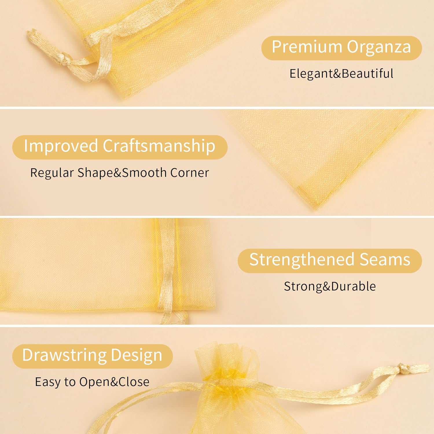 - Package Details: Package comes in 50 pcs gold organza bags, with a size of 3x4 inch, offering a practical and stylish solution for organizing and presenting small items.