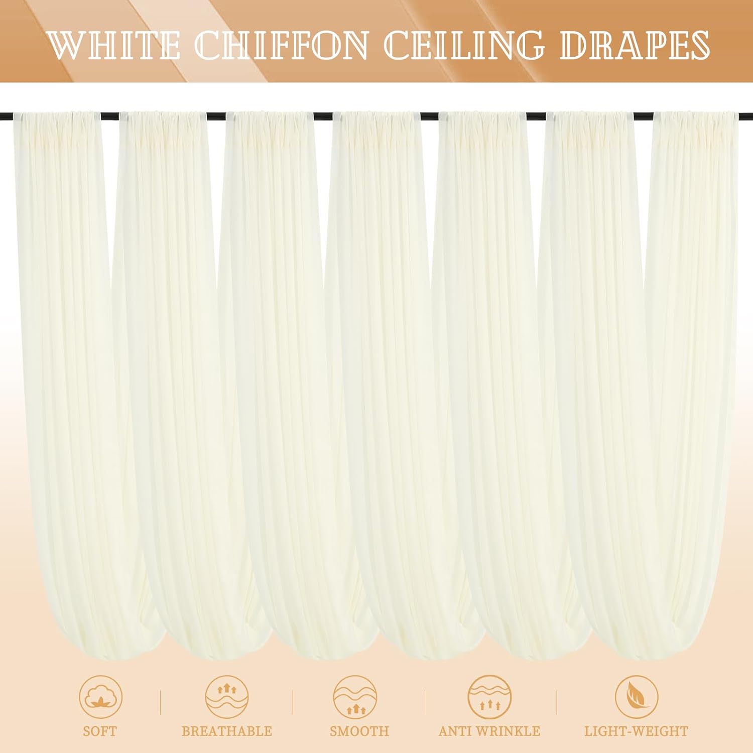 - 【Soft Sheer Material】Long wedding drapes is made of soft touch chiffon fabric. All edges are finished with firm and exquisite stitching, airy and light-weighted. Wrinkle-free, easy draping or hanging straight, good vertical sense and durable. These backdrop curtains will help to create a great eye catching detail in your wedding ceiling decoration.