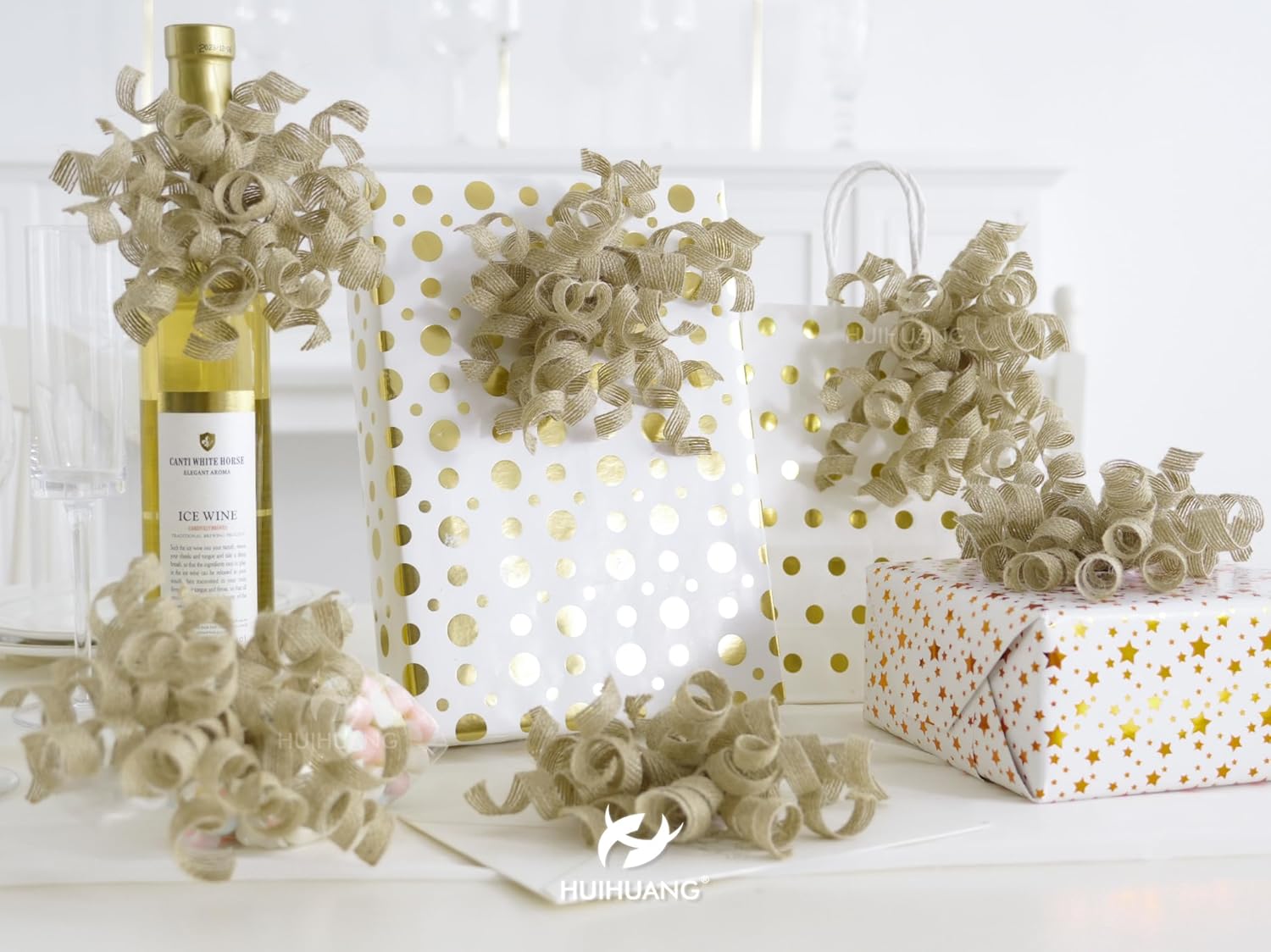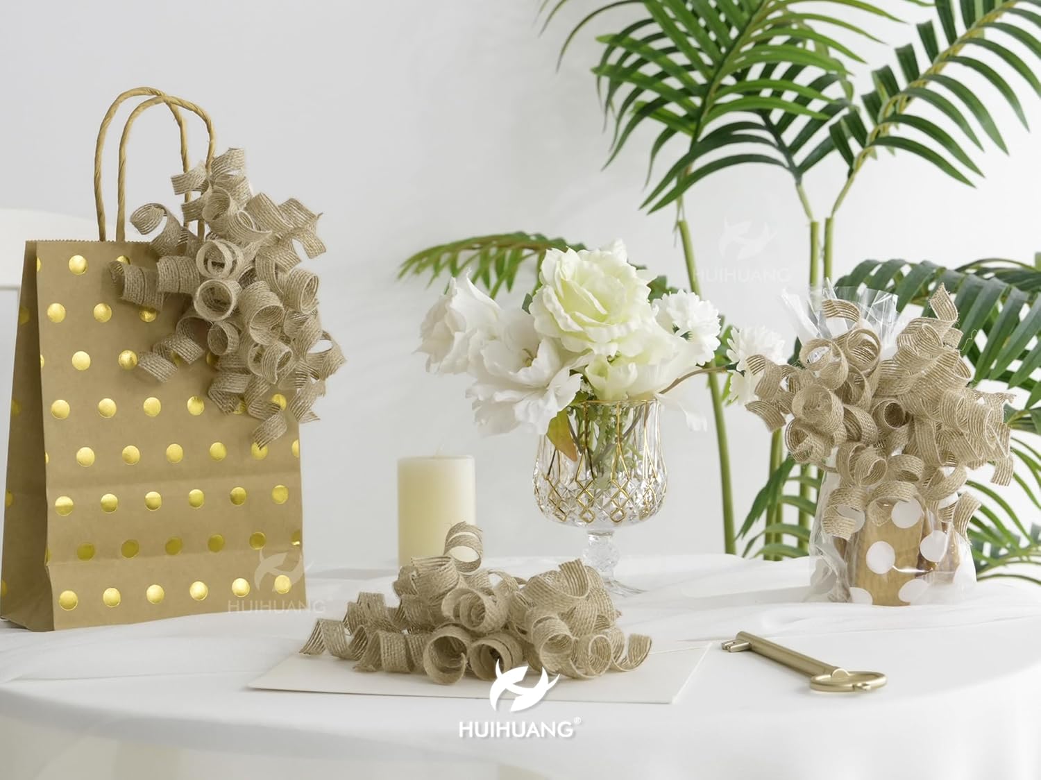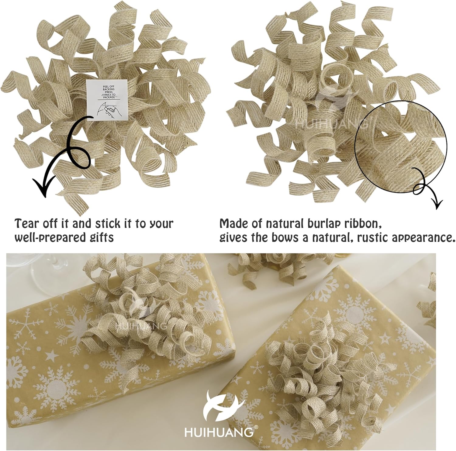 - SIZE & PACK: Each package contains 6 pcs burlap curly bows are made of 12 strands of 3/8"(9mm) wide natural burlap ribbon that measure about 5~5.5" x 5~5.5". Burlap has a coarse and textured feel, which adds a rustic and earthy touch to gift wrapping