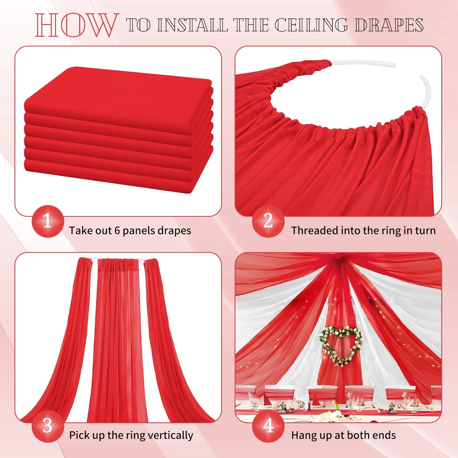 - 【Chiffon Fabric Curtain】The package will include 6 panels red wedding ceiling drapes (Not include stand), each wedding extra long curtain measures 5 feet(60inch)wide x30 feet(360inch) long. Sufficient quantity can meet your needs. These arch draping are applicable for any indoor and outdoor occasion either for decorative or functional uses.