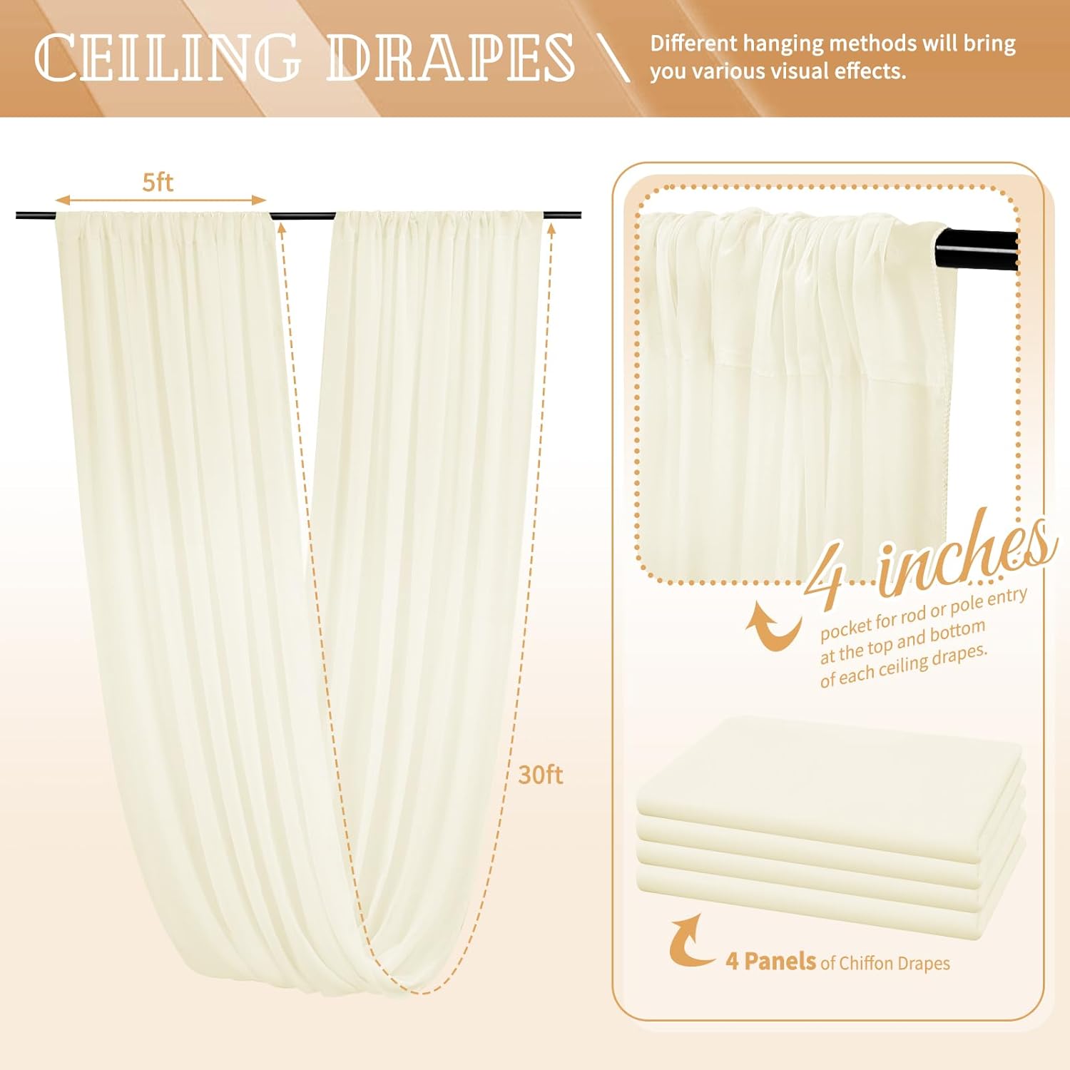 - 【Chiffon Fabric Curtain】The package will include 4 panels Ivory wedding drape curtain, each wedding extra long curtain measures 5 feet(60inch)wide x30 feet(360inch) long. Sufficient quantity can meet your needs. These backdrop curtains are applicable for any indoor and outdoor occasion either for decorative or functional uses.