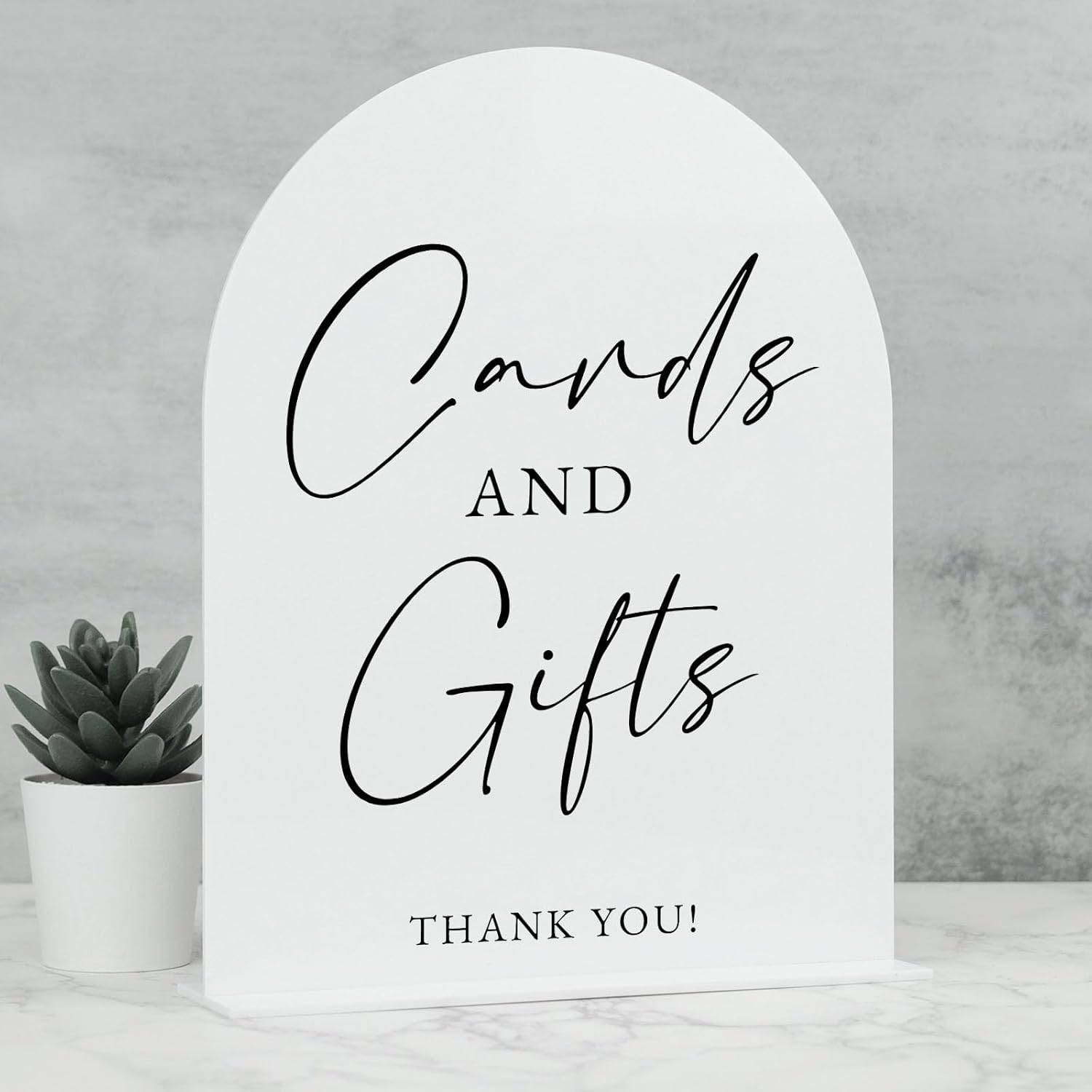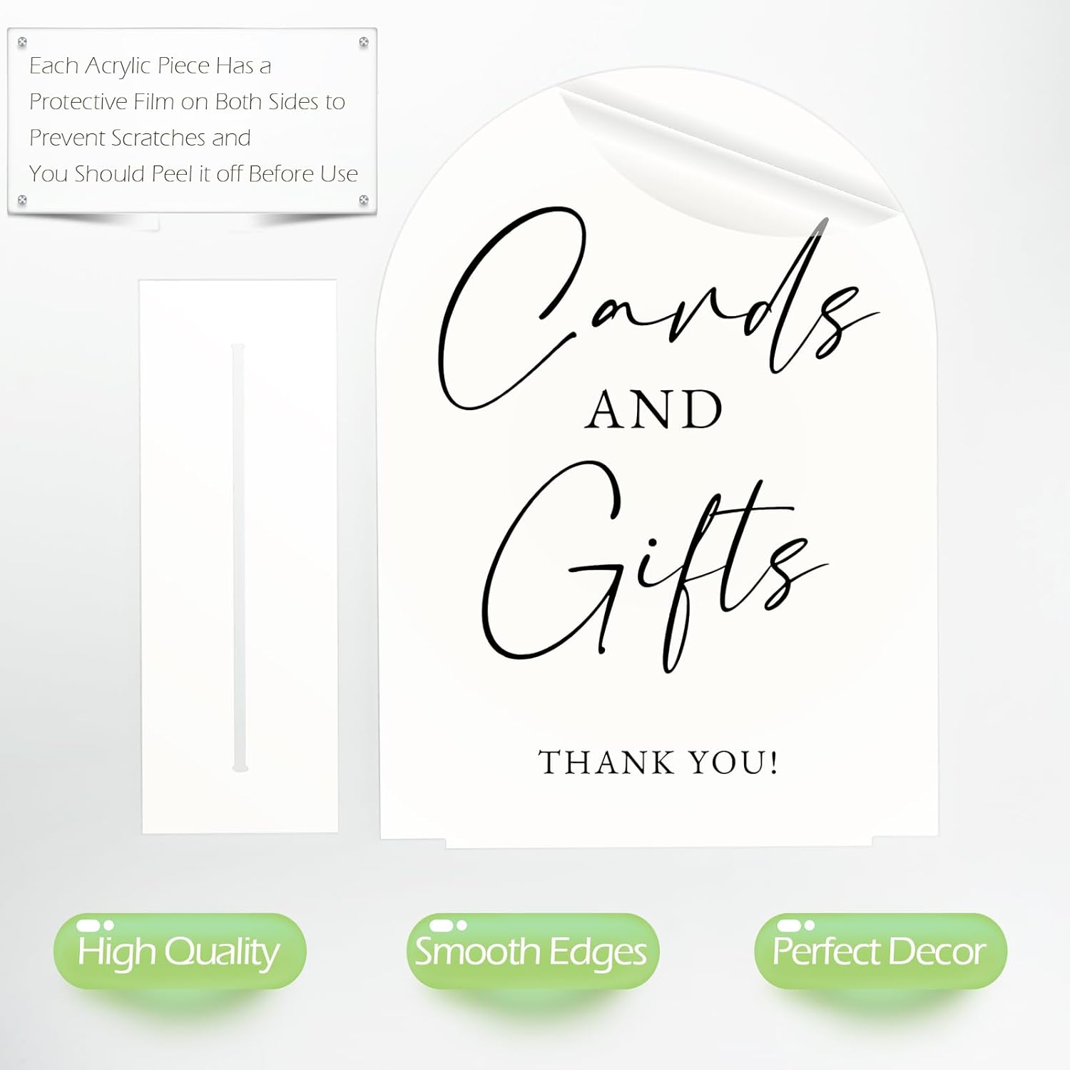 - Stable and Durable: Our white arch acrylic cards and gifts sign easily fits into the slot located in the middle of the acrylic base, ensuring it stays upright and securely in place. The acrylic sign base is made of 1/8" thick acrylic material, sturdy and durable, they can keep the table cards stand steadily.