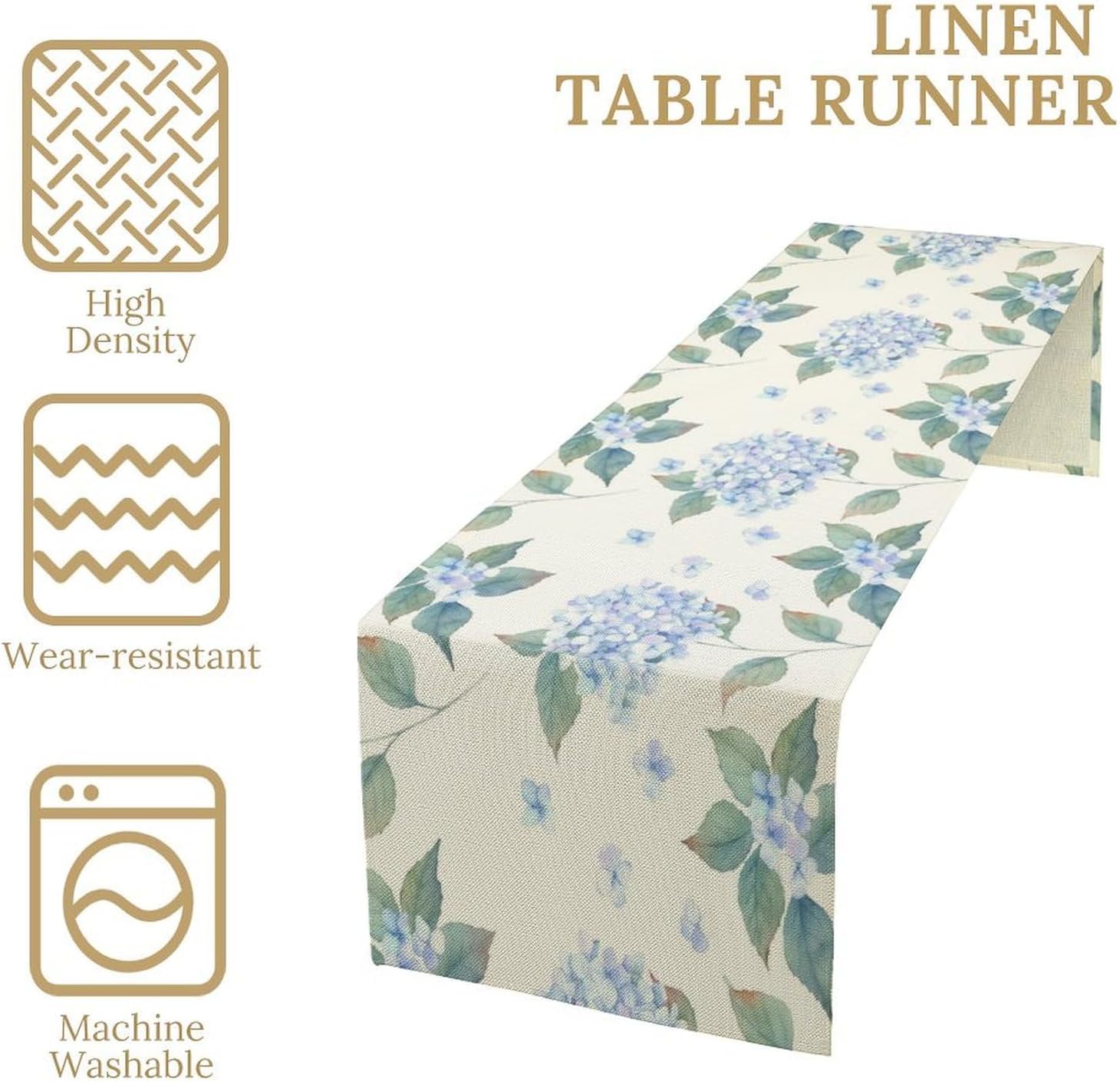Spring Hydrangea Flower Table Runner, Seasonal Summer Plants Watercolor Blue Florals Dinner Runner for Home Kitchen Dining Table Party Holiday Decoration 13"x60"