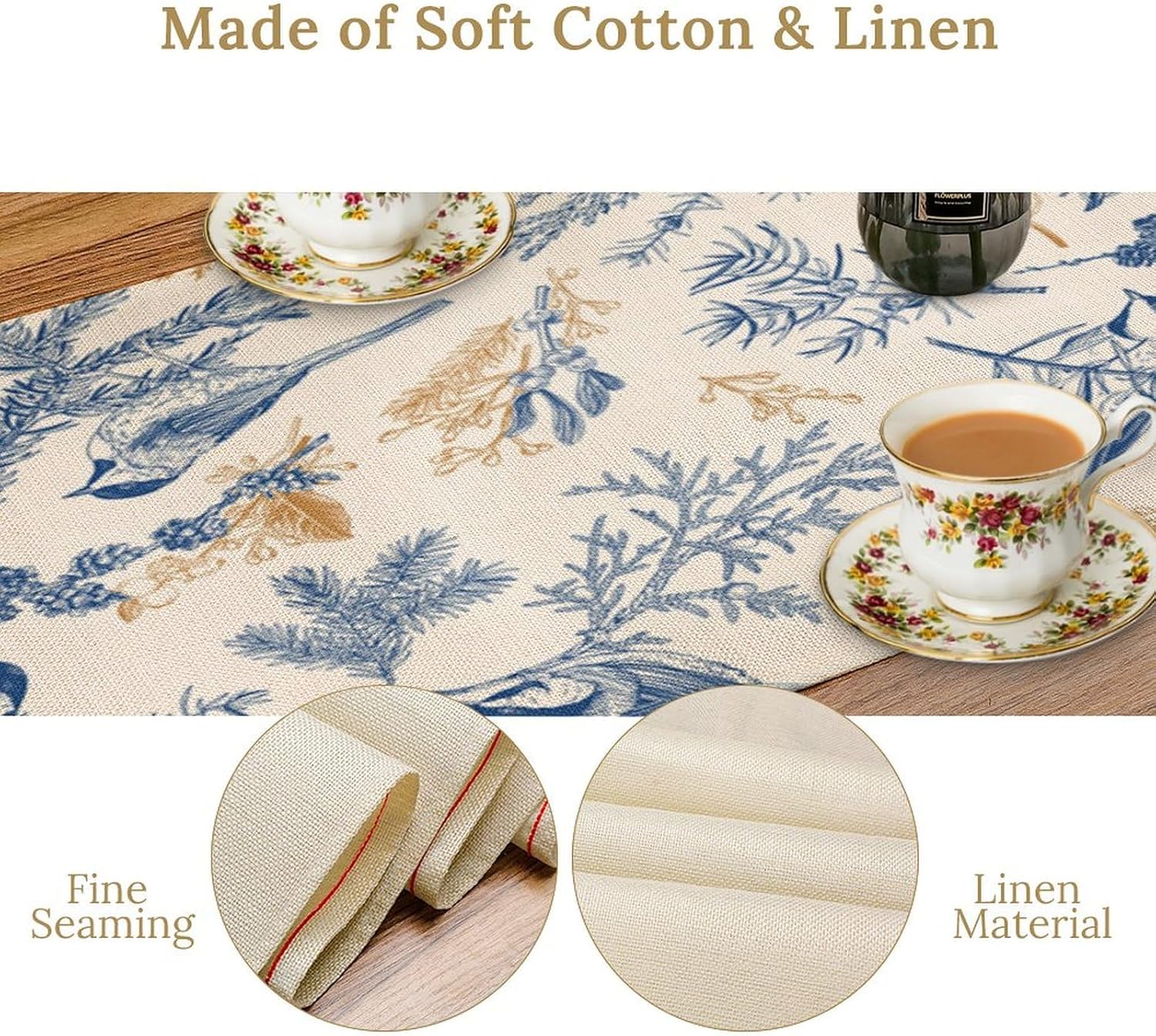 Chinoiserie Flowers Table Runner, Seasonal Spring Fall Plants Blue Florals Birds Dinner Runner for Home Kitchen Dining Table Party Holiday Decoration 13"x108"