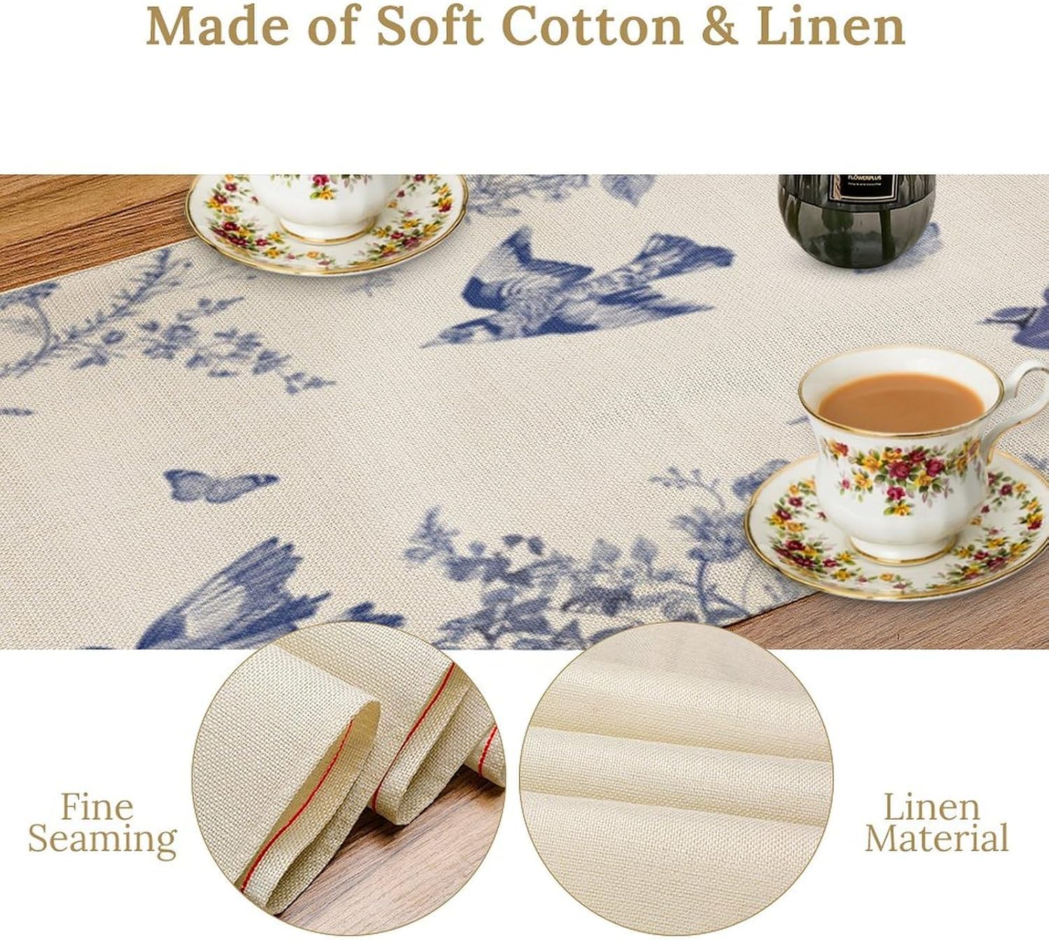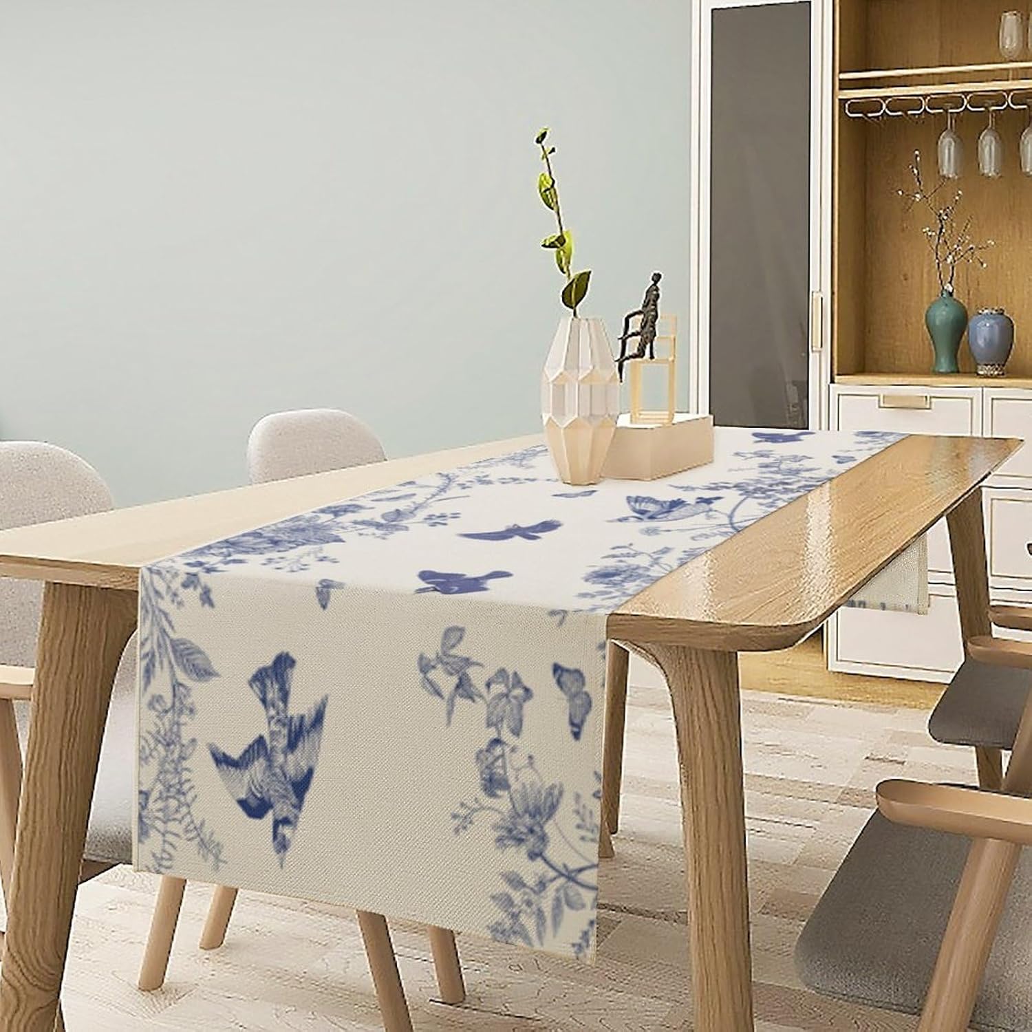 Monochrome Sketch Flowers Bird Table Runner, Seasonal Spring Fall Plants Blue Florals Dinner Runner for Home Kitchen Dining Table Party Holiday Decoration 13"x108"