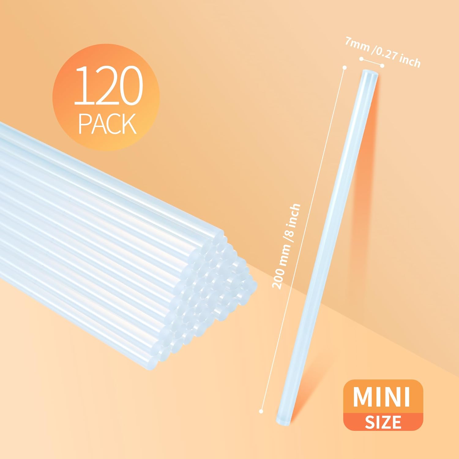 - 【Value Pack】120 pcs Crystal Clear hot melt glue Sticks Mini Size, 7mm/0.27 inch diameter and 200mm/8 inch glue sticks tool, compatible with most glue guns on the market, Long hot glue sticks, No need to change glue sticks Frequently.