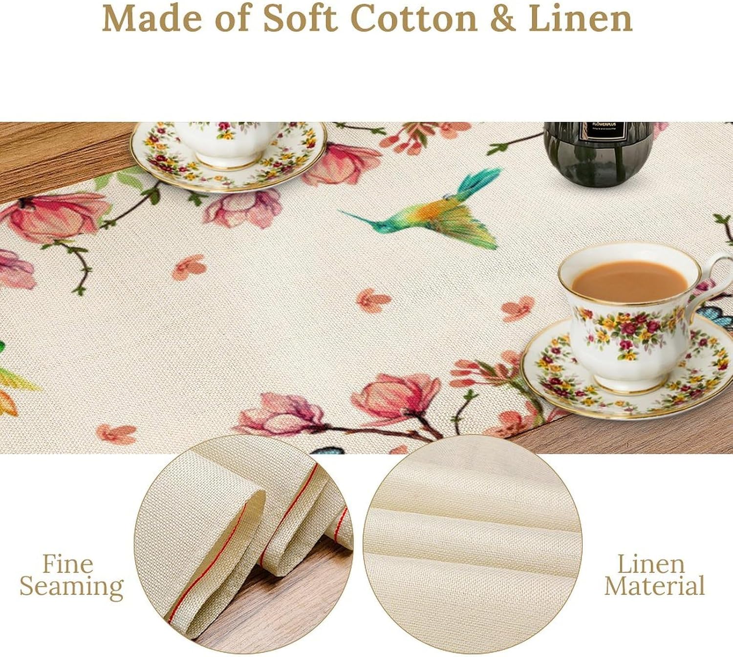 Vintage Watercolor Flower Hummingbird Table Runner Seasonal Spring Garden Plants Birds Florals Farmhouse Country Kitchen Dinner Runner Dining Table Decoration 13"x70"