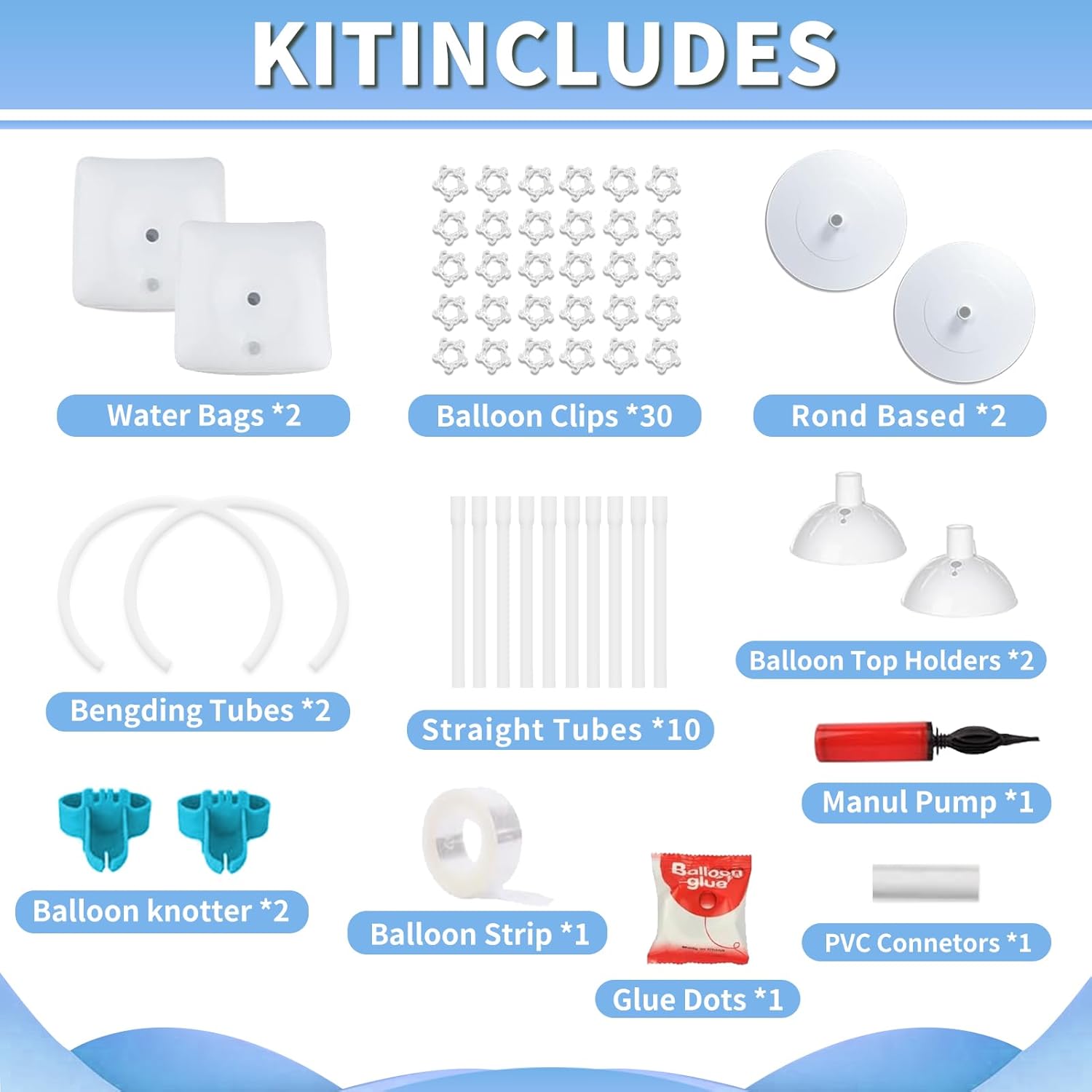 - ăAll-in-One KităOur balloon arch kit includes everything you need: 10 straight poles, 2 bendable top poles, 2 round bases, 2 water/sand bags, 30 balloon clips, 2 balloon top supports, 2 balloon knotters, 1 roll of glue dots, 1 balloon arch strip, 1 PVC connector, 1 manual pump, and detailed instructions.